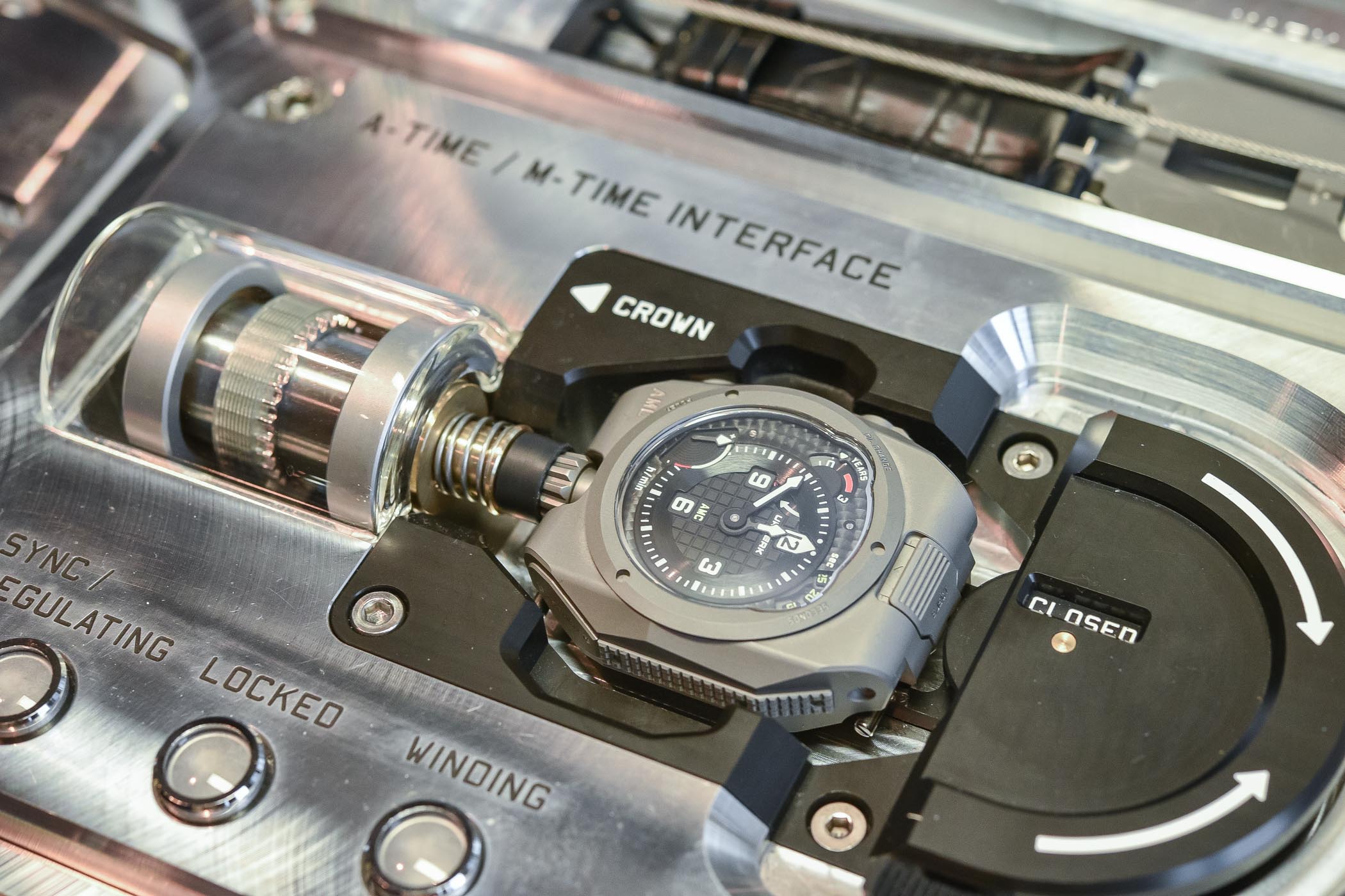 The mother clock is a spaceship-shaped block of aluminium measuring 45cm x 30cm x 18cm and the AMC atomic clock will keep nearly perfect time, guaranteed to within one second in 317 years. The master clock will rewind the URWERK wristwatch, set it to the correct time and if necessary adjust its rate – and all of that through a series of mechanical pins and triggers. Three pieces will be produced (incl. one for URWERK) with a retail price that will probably be over EUR 1,000,000.