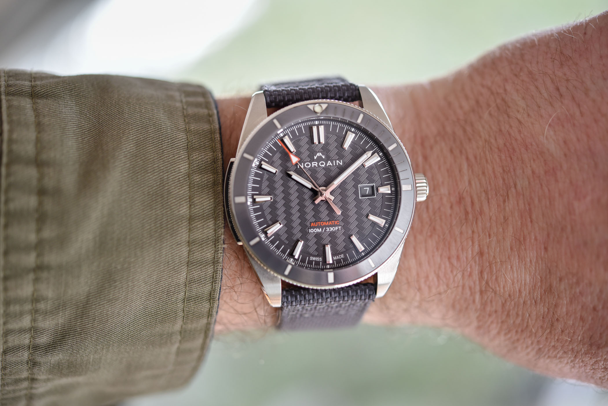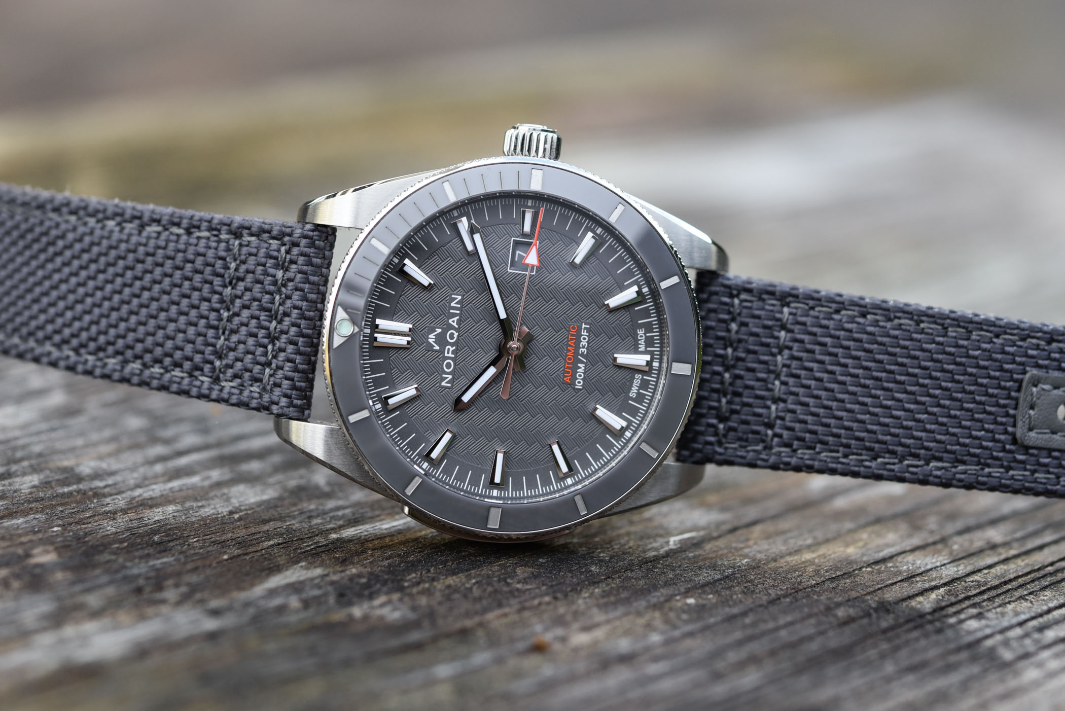 Quick facts: 42mm steel case – unidirectional bezel with ceramic insert – calibre Norqain NN09 (base ETA 2824) – automatic – 100m water-resistant – cordura fabric strap on pin buckle – CHF 1,830 – www.norqain.com