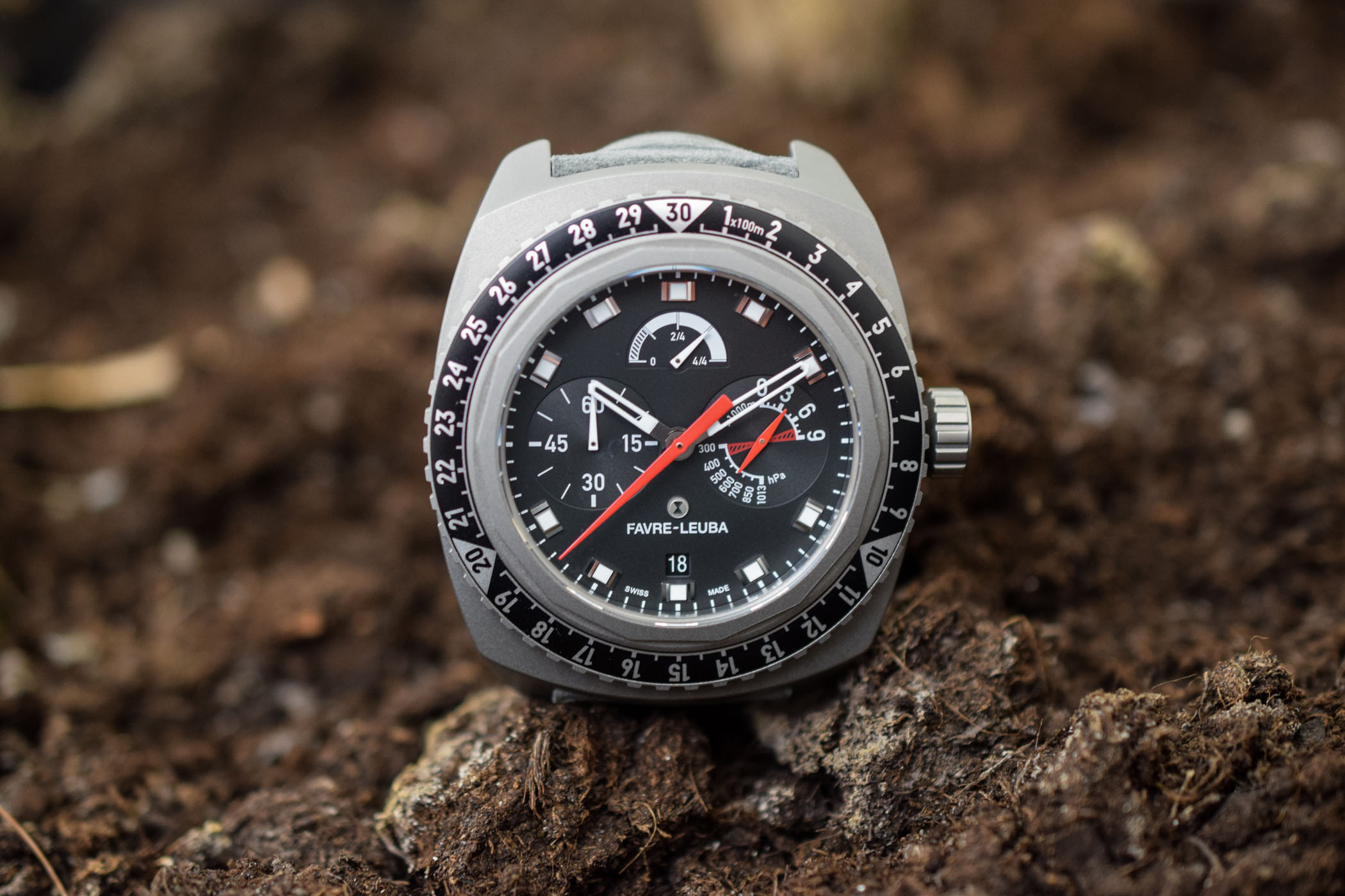 If you want to talk tool watches made for adventures, you can’t beat the Favre-Leuba Bivouac 9000… This watch is the true definition of an exploration watch. Not only because of its ultra-solid titanium case, of its overall instrument look, or its RECCO® reflector strap (a technology which helps find victims of avalanches)… No, it’s mainly because of its rare mechanical altimeter complication, which can measure altitudes up to 9,000 metres with precision – meaning everywhere on Earth, even on top of Mount Everest – and that’s unique in the watch industry. The movement is based on the Eterna Calibre 39 and has an altimeter module with an aneroid capsule (developed in-house by Favre-Leuba). The only drawback is a water-resistance of just 30m.