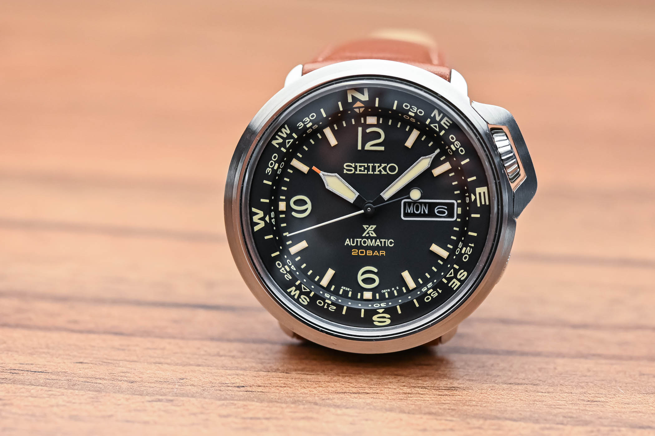 Quick facts: 43mm diameter – stainless steel case – 200m water-resistant – Seiko calibre 4R36, automatic – hours, minutes, seconds, day-date – brown leather strap – ref. SRPD31K1 – EUR 429