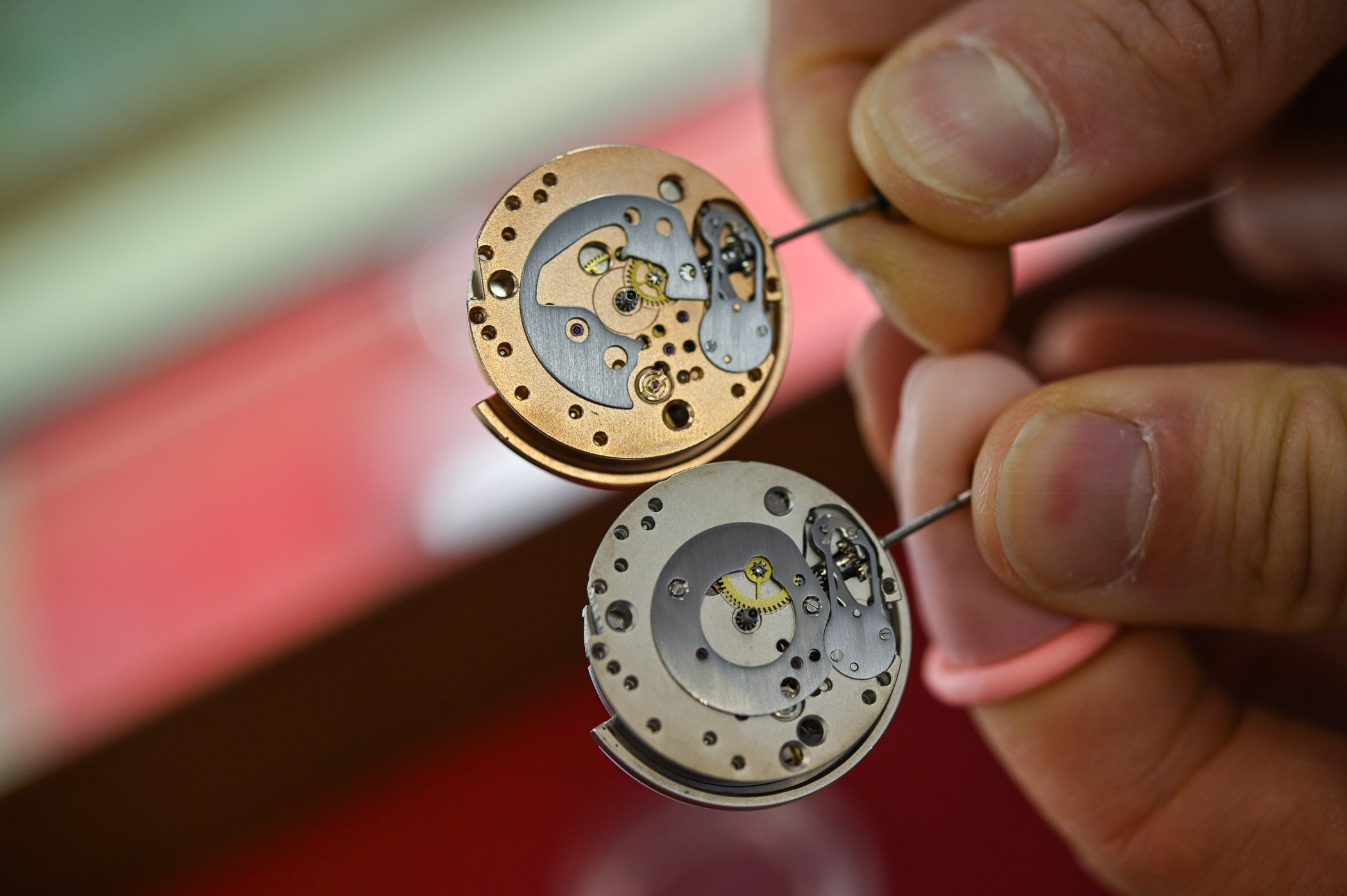 One important factor with Raketa is that the movements are almost entirely produced internally, with the exception of certain parts (such as jewels or ball bearings for instance). Plates, bridges, screws, wheels, springs, oscillating weights, balances or even escape wheels are produced in this manufacture, in the most traditional way. From raw material to finished product, everything is performed internally, even the plating or galvanisation of the parts that are done in a small atelier near the manufacture, by a lady with Ray-Ban glasses and a cigarette in her mouth – really… this is something special.