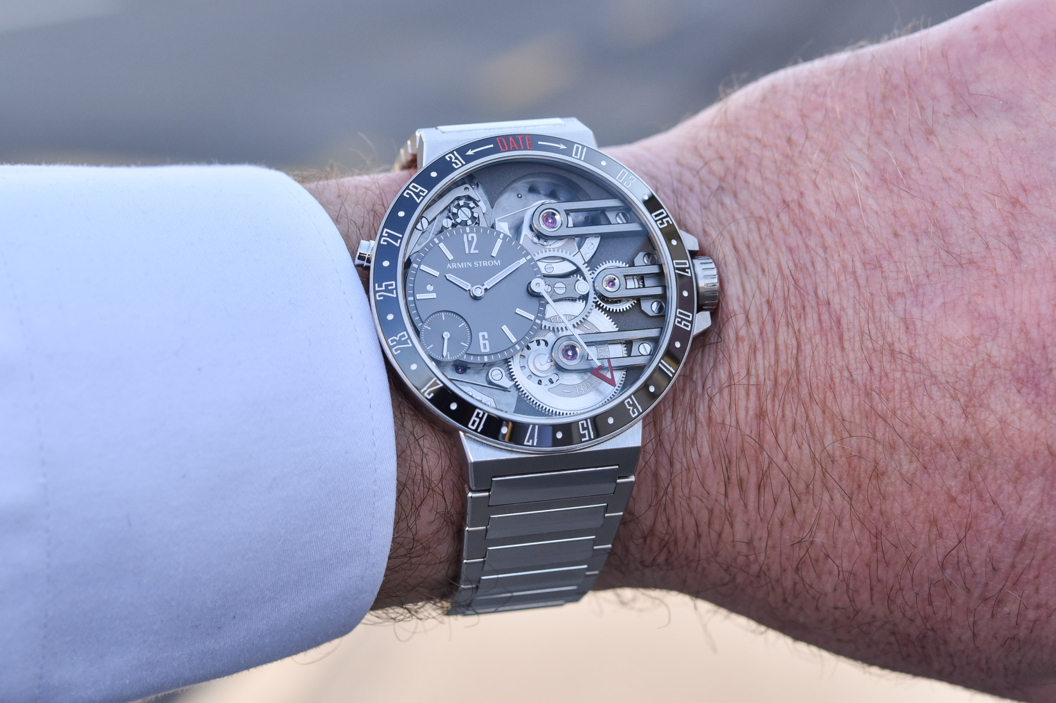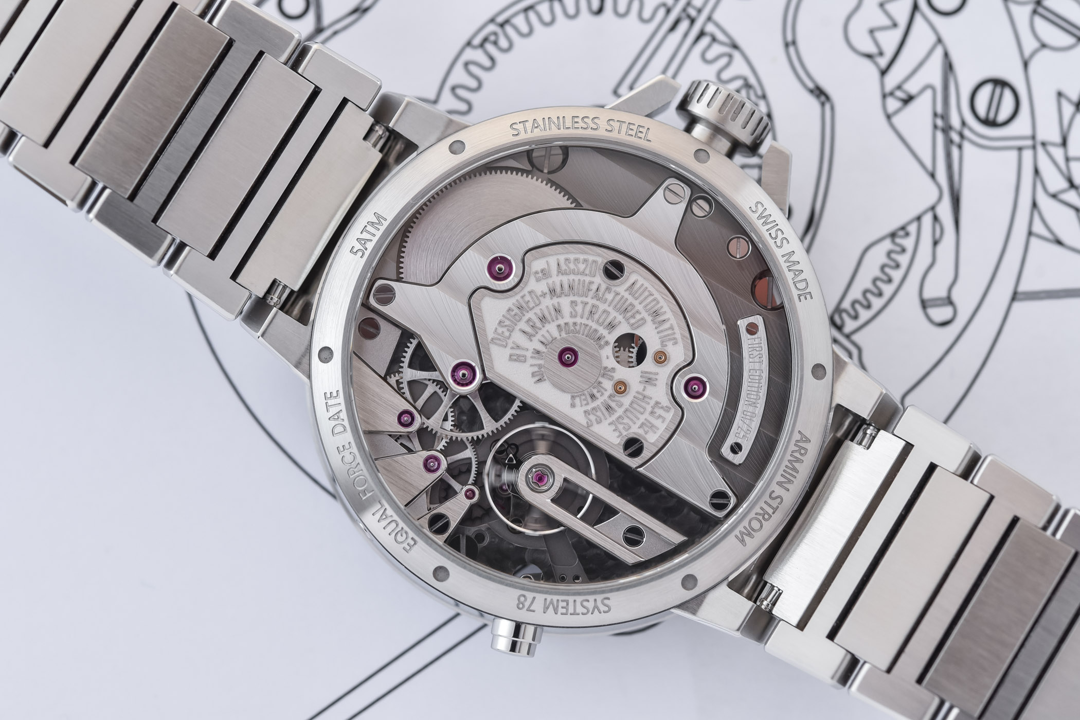 Quick Facts – 43.4mm x 12.6mm – stainless steel case – fixed ceramic bezel with date scale – sapphire crystal front and back – 50m water-resistant – off-centred black gold dial – numerals and indices with Super-LumiNova – in-house made hands with Super-LumiNova – Armin Strom Calibre ASS20, in-house – automatic with micro-rotor – 297 components – 25,200vph – 30 jewels – 72h power reserve – Geneva-drive equal force barrel – offset hour and minutes, small seconds, column-wheel date, power reserve indication on the barrel – stainless steel bracelet with folding clasp – limited to 25 pieces – EUR 31,300
