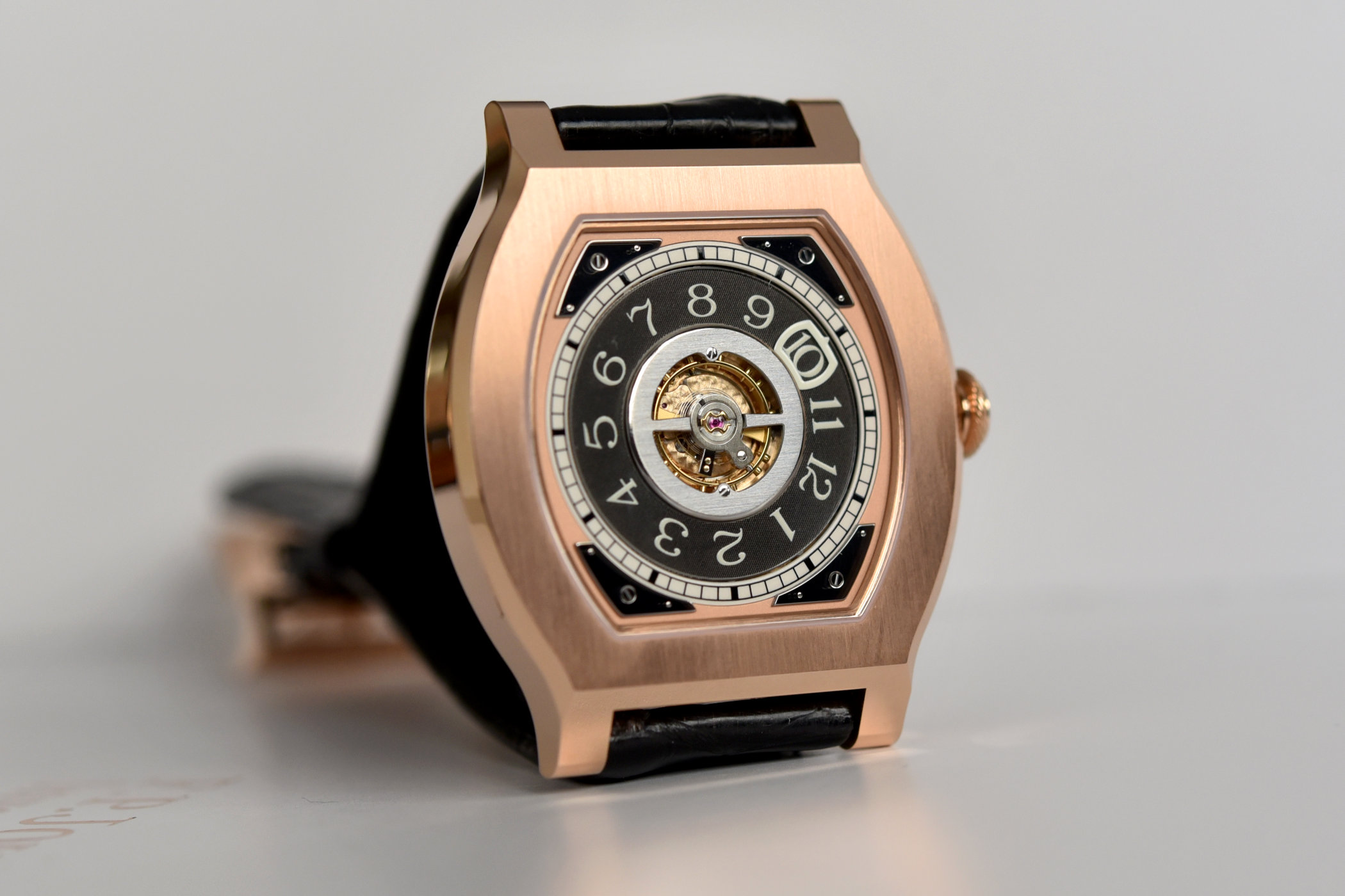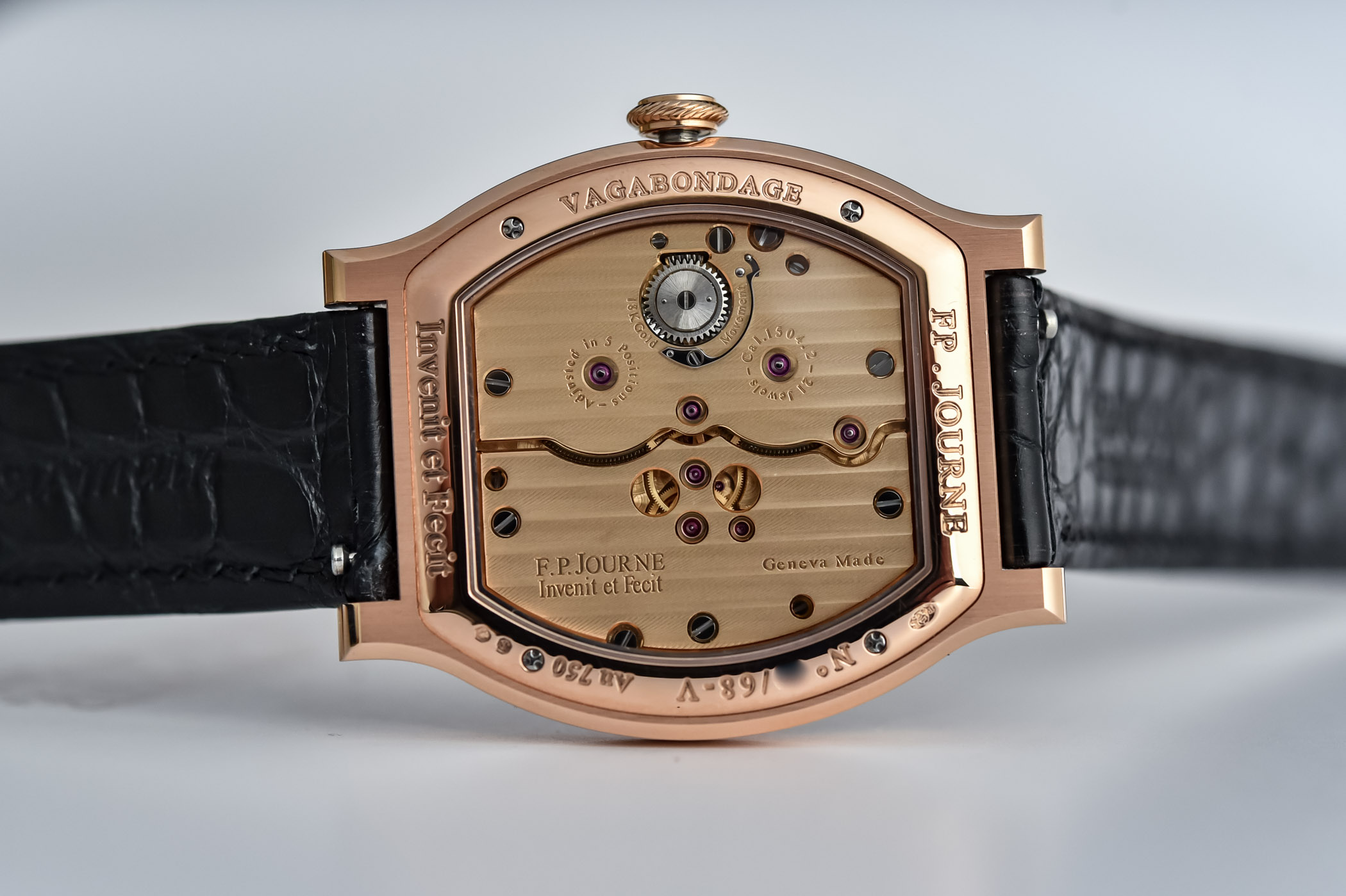 Quick Facts – 45.2mm x 37.5mm x 7.6mm – flat tortue shaped 18k red gold case, brushed and polished – sapphire crystal front and back – wandering hours on slate grey disc – silver mobile aperture for hours – peripheral railway-style minutes track – sapphire disc in the centre of the dial protecting the balance and escapement – screwed steel elements on each corner – F.P.Journe Calibre 1504.2 in rose gold – manual-winding – 21,600vph – 50h power reserve – two barrels in parallel – straight-line lever escapement – black alligator leather strap with 18k gold folding clasp – limited to 68 pieces with priority allocation for matching serial numbers of Vagabondage II and III in gold – price on application
