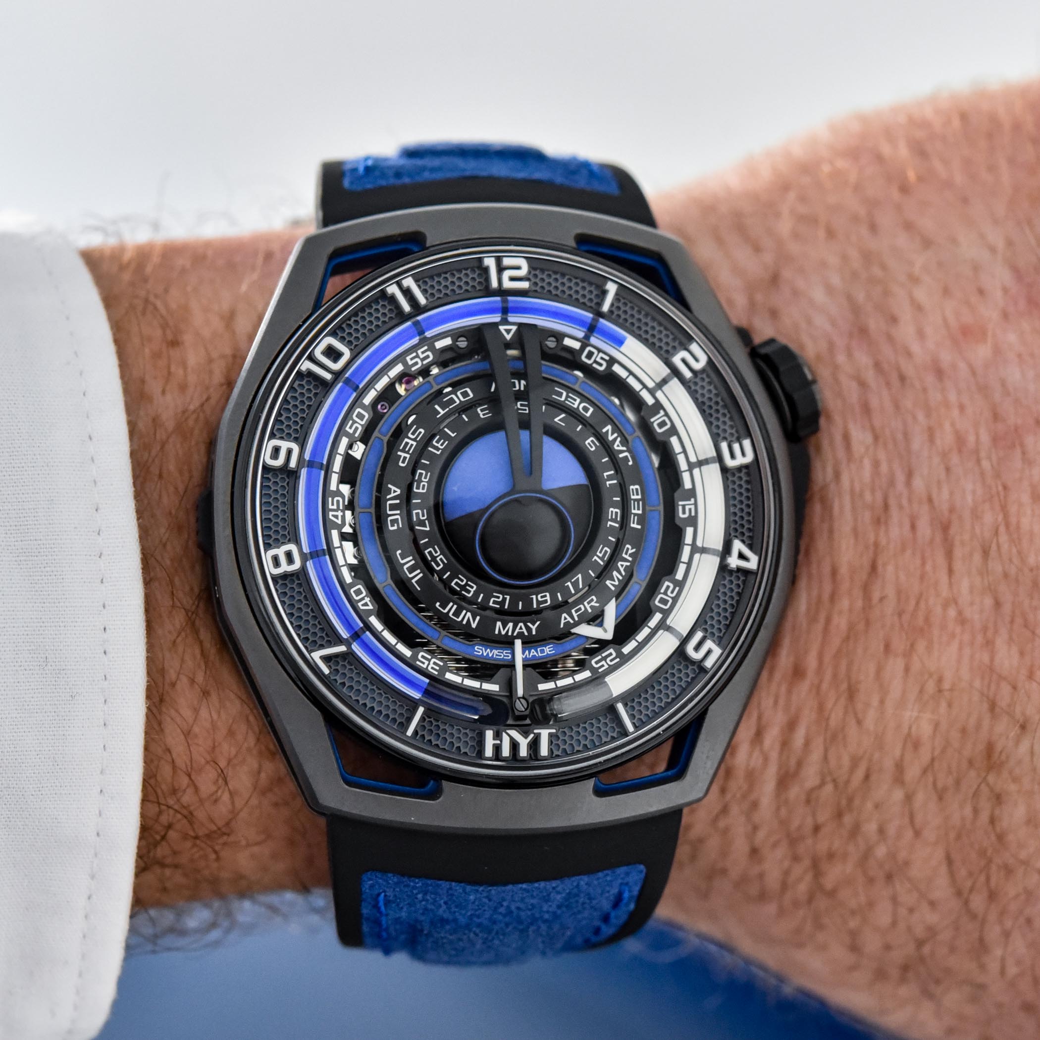 Quick Facts – 48mm x 52.3mm x 13.3mm – grey and blue sandwich-constructed titanium case – screw-down crown in black titanium – domed sapphire crystal – 50m water-resistant – Supernova blue fluid hour display with luminescent numerals – matte black minutes track with triangular indicator – months and day rings in black – central spherical moon phase in black and blue with circular aperture – Calibre HYT 601.MO – proprietary movement, developed by Eric Coudray – hand-wound – 41 jewels – 28,800vph – 72h power reserve – retrograde fluidic hours, minutes, months, date, 3D moon phase – two-tone black rubber with blue Alcantara with black titanium clasp – limited to 27 pieces – CHF 100,000 (excl. taxes)