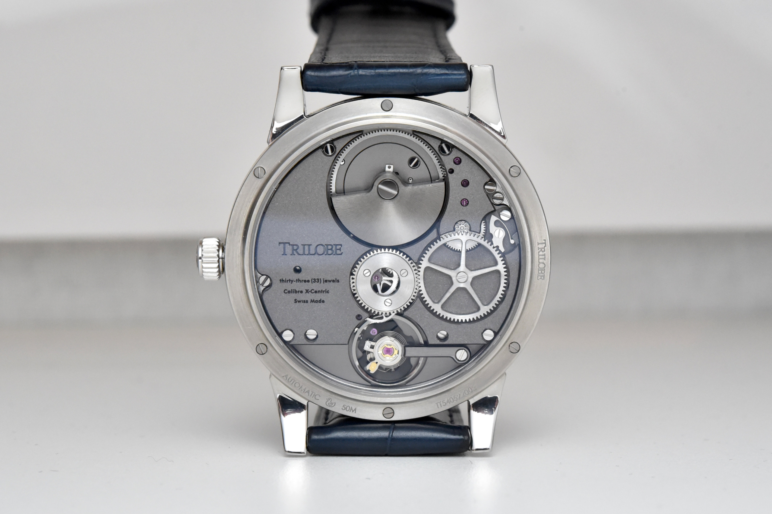 Quick Facts – 40.5mm x 17.8mm – 10.8mm domed sapphire crystal – grade 5 titanium case, brushed and polished – sapphire caseback – screw-down crown – 50m water-resistant – deconstructed display of time with rotating floating rings – fixed pointers as “hands” – black or blue DLC coated titanium rings – Calibre X-Centric, proprietary movement developed by Mojon and made by Le Cercle des Horlogers – automatic with micro-rotor – 196 components incl. 33 jewels – 28,800vph – 48h power reserve – hours, minutes, seconds – black or blue alligator leather strap with titanium pin buckle – EUR 21,500 (incl. taxes).