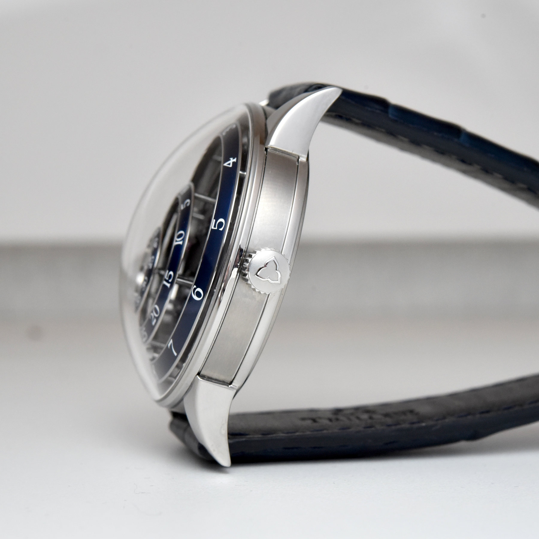 Quick Facts – 42.8mm x 11.7mm (without crystal) or 15.3mm (with crystal) – screw-down crown – domed sapphire crystal with sapphire crystal caseback – 120m water-resistant – skeletonized construction – off-centred funky blue fumé dial for hours and minutes – applied Globolight indices – hour and minute hands with Globolight inserts – one-minute flying cylindrical tourbillon – Calibre HMC 811, in-house – fully skeletonized construction – bi-directional pawl winding system with skeletonized gold rotor – 74h power reserve – hand-shaped cylindrical hairspring with 2 Breguet curves – hand-stitched black alligator leather strap – steel folding clasp – CHF 79,000