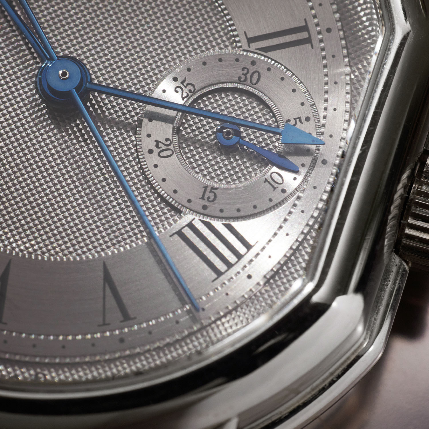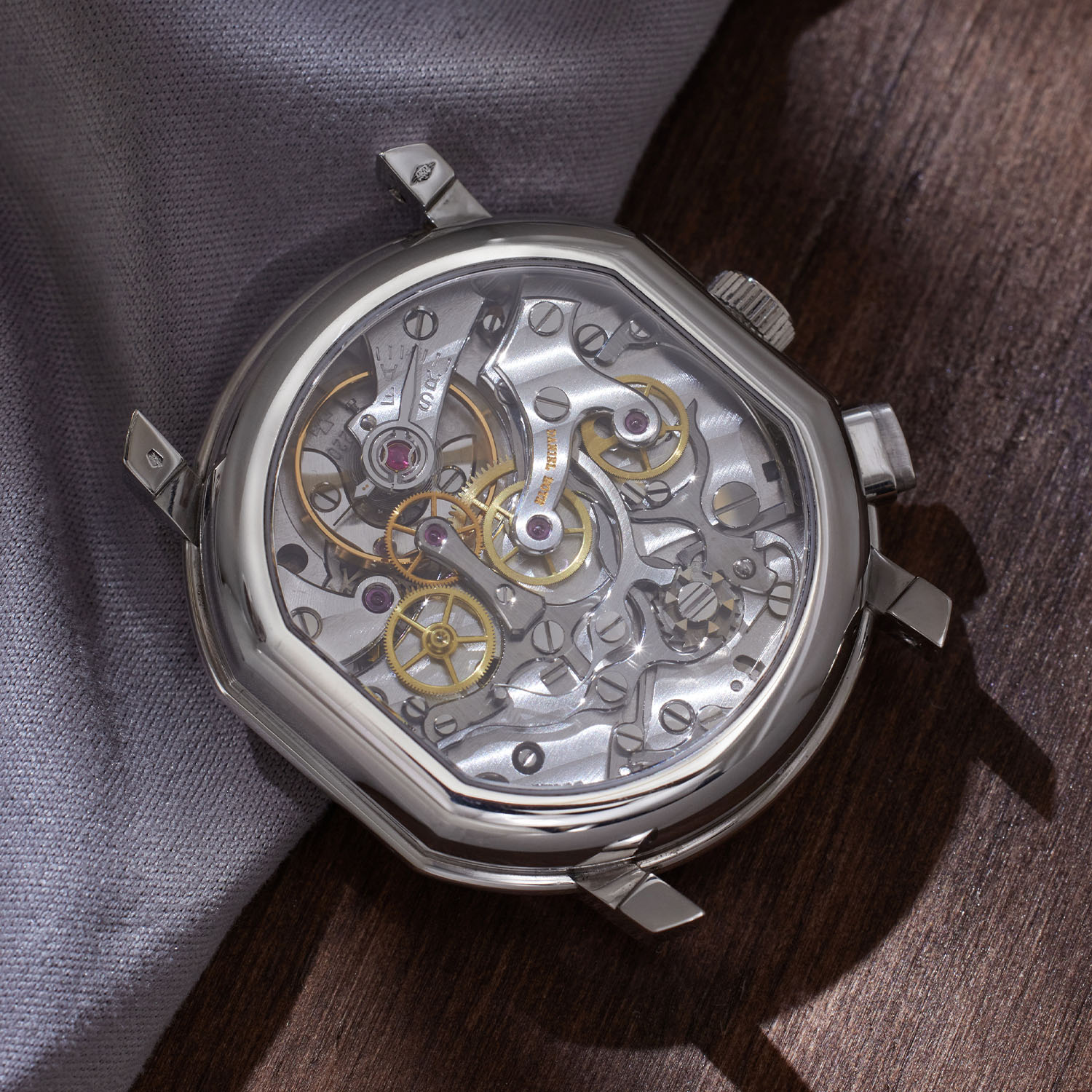 Inside the double-ellipse platinum case are a handsome movement and a beautiful dial in a restrained shade of grey gold, with clous de Paris guilloché and blued hands. This watch is part of the first batch of 16 platinum Monopushers and is offered in very good condition overall. More details here.