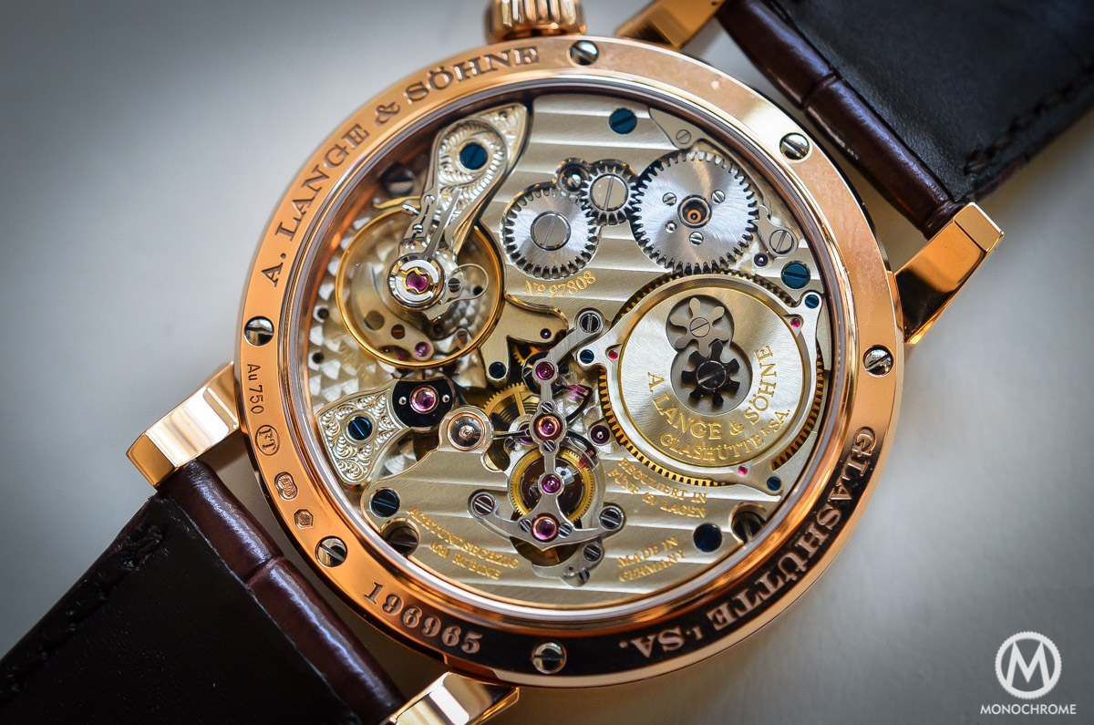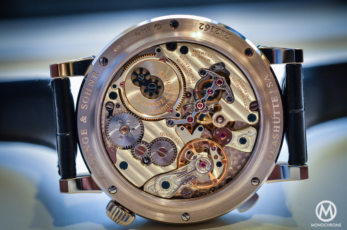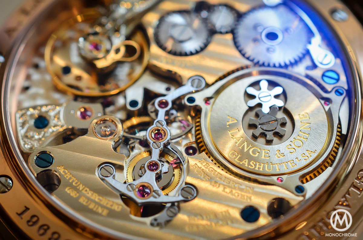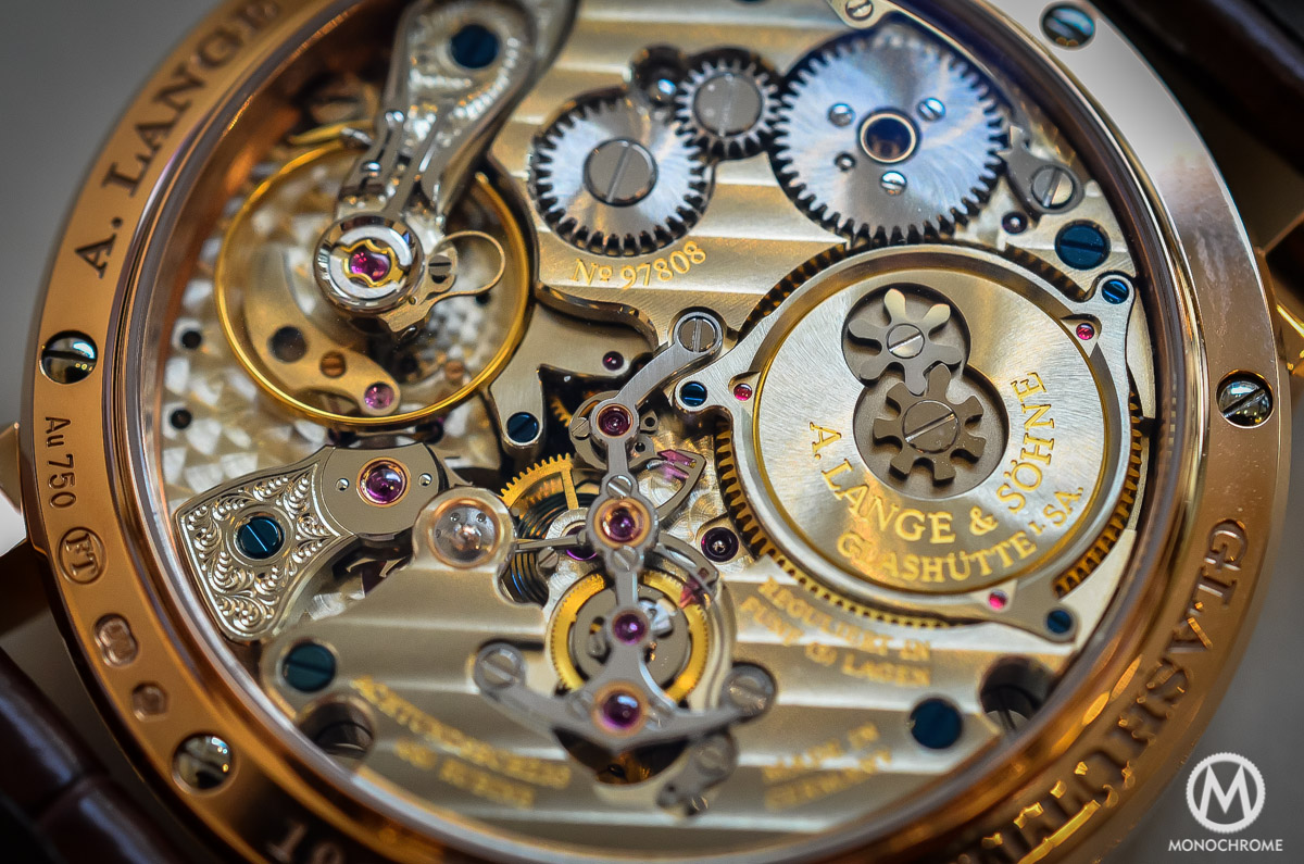 The view from the back of the watch is similar to the ‘normal‘ Zetiwerk, as the strike train is located just under the dial (at 6, under the small-seconds). We can find the same movement, always very nicely finished and with the same incredible layout (yes, I have to admit, I love this anchor bridge). The main difference of the A. Lange and Sohne Zeitwerk Striking Time is its size, brought to 44.2mm, due to the extra-chiming complication. On the wrist, the watch is larger (+ 2.3mm) and thicker (+ 0.5mm at 13.6mm) but still very well balanced, both for the visual aspect (as all the proportions have been increased) and for the wearability. The curved lugs allows a good position – even if we have to admit that it will require a large wrist and that the ‘normal‘ Zeitwerk is better sized. However, considering the added complication, we can make exceptions and feel love too for the Striking Time.