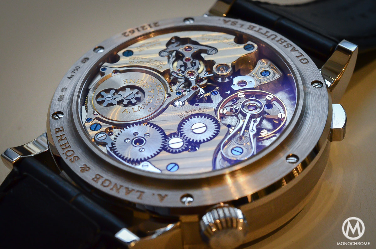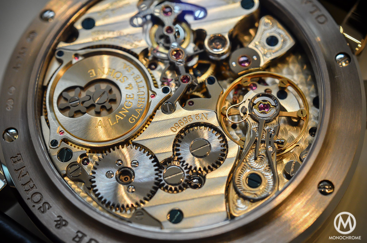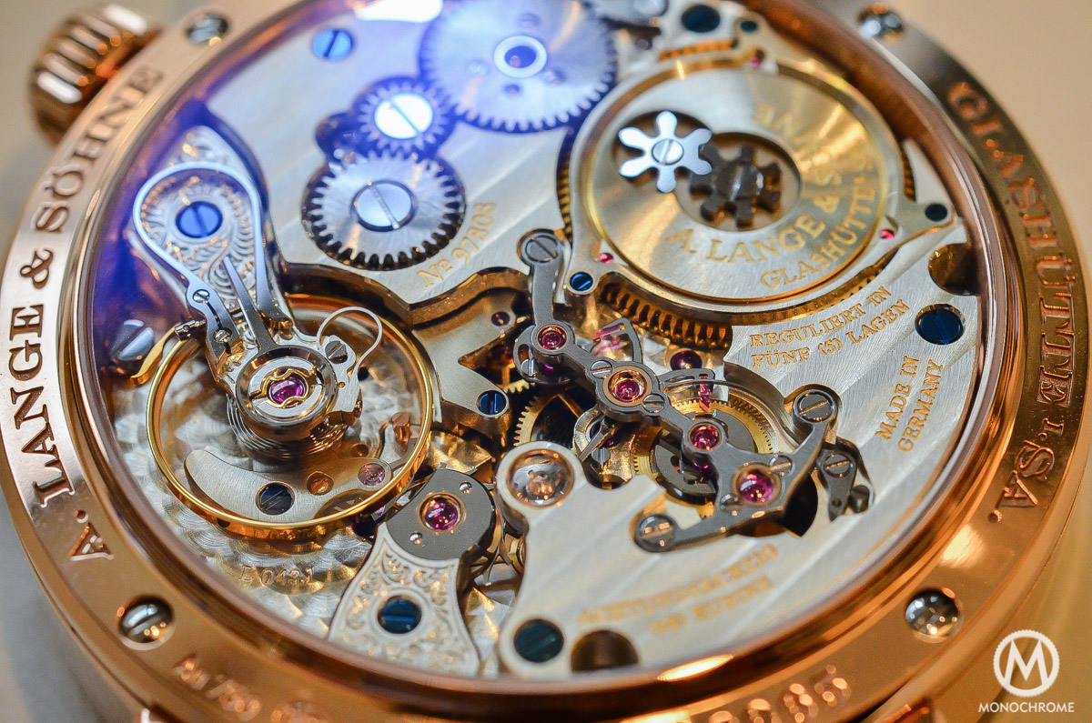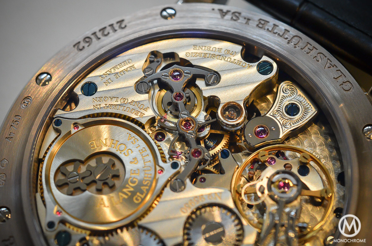 The view from the back of the watch is similar to the ‘normal‘ Zetiwerk, as the strike train is located just under the dial (at 6, under the small-seconds). We can find the same movement, always very nicely finished and with the same incredible layout (yes, I have to admit, I love this anchor bridge). The main difference of the A. Lange and Sohne Zeitwerk Striking Time is its size, brought to 44.2mm, due to the extra-chiming complication. On the wrist, the watch is larger (+ 2.3mm) and thicker (+ 0.5mm at 13.6mm) but still very well balanced, both for the visual aspect (as all the proportions have been increased) and for the wearability. The curved lugs allows a good position – even if we have to admit that it will require a large wrist and that the ‘normal‘ Zeitwerk is better sized. However, considering the added complication, we can make exceptions and feel love too for the Striking Time.
