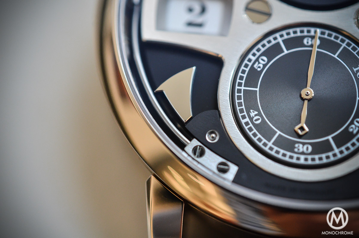 We told you, the solution is a patented constant-force escapement that takes place between the barrel wheel and the regulating organ (balance wheel). The mechanism is showed into the movement by a sort of gear train hold in place by a anchor bridge (detailed on the photo bellow). It stores energy during a whole minute and delivers it for each instant jump. Thus, it brings enough power to the gears to make the discs jump instantaneously and also disable the undesirable effect of the strong spring on accuracy – it stabilizes the rate of the movement across the entire 36-hour autonomy period. It drives the balance with nearly uniform power, regardless of the state of wind of the mainspring and unaffected by the energy-consuming switching cycles that take place in one-minute intervals. This is state-of-the-art horology: Constant-force escapement (or remontoire) are not common features. Only a few watchmakers can achieve such a technology: F.P. Journe with its Chronomètre Optimum is one of them. A. Lange and Sohne also uses something similar in the Lange 31 or in the Richard Lange Terraluna.