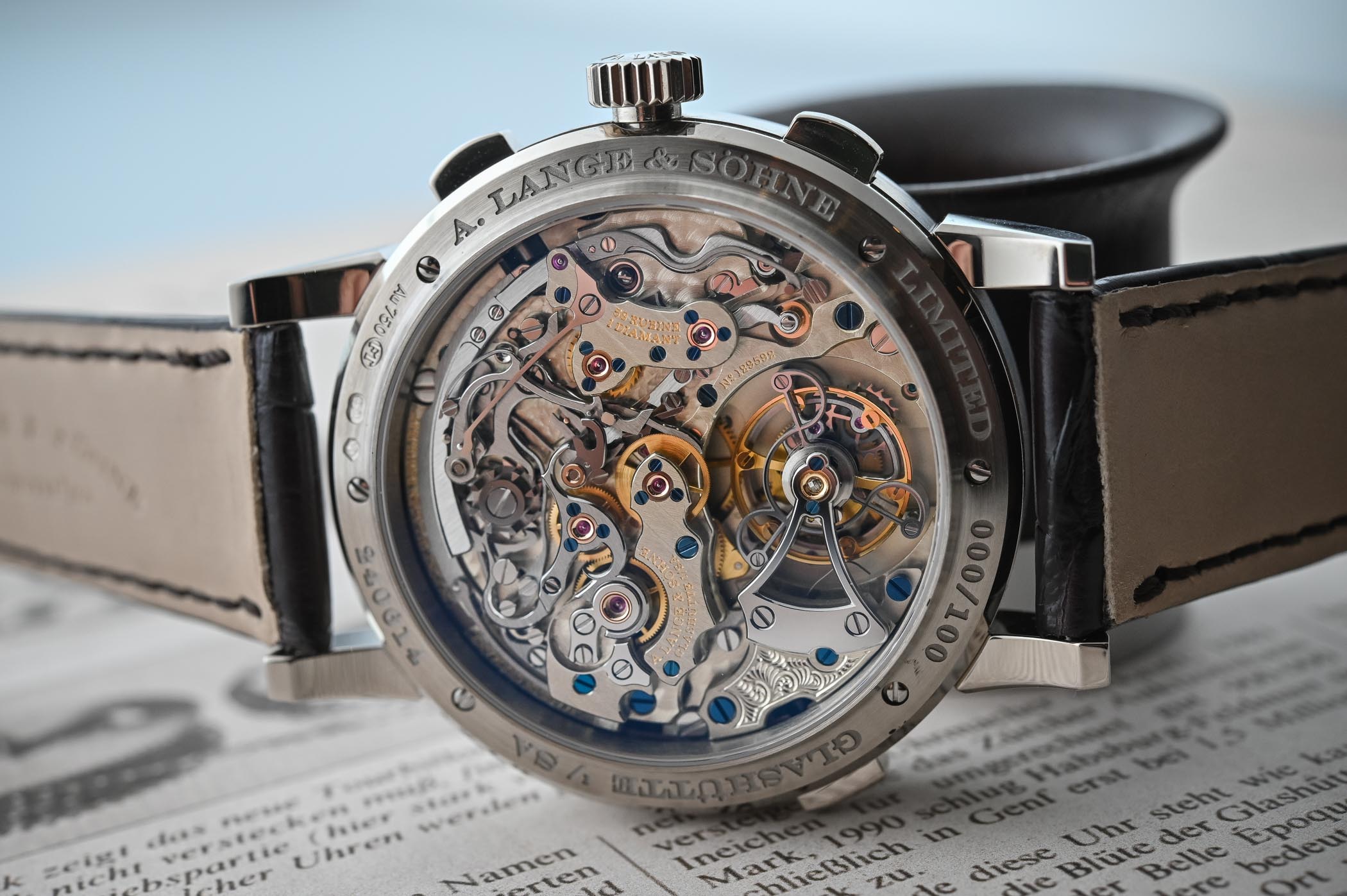 The movement of this new A. Lange & Söhne Datograph Perpetual Tourbillon with Pink Gold dial is exactly the same as the one used in the inaugural black dial edition. The base is the chronograph movement of the Datograph (column-wheel, horizontal clutch) on which a QP module is added and with a regulating organ that has been replaced. The view through the caseback is simply mesmerizing, with an impression of depth and opulence that only Lange can achieve. Decoration and finishing are, as expected, impressive. For more details about the watch, its movement and its complications, check our previous article here.