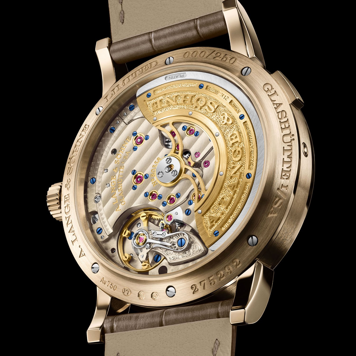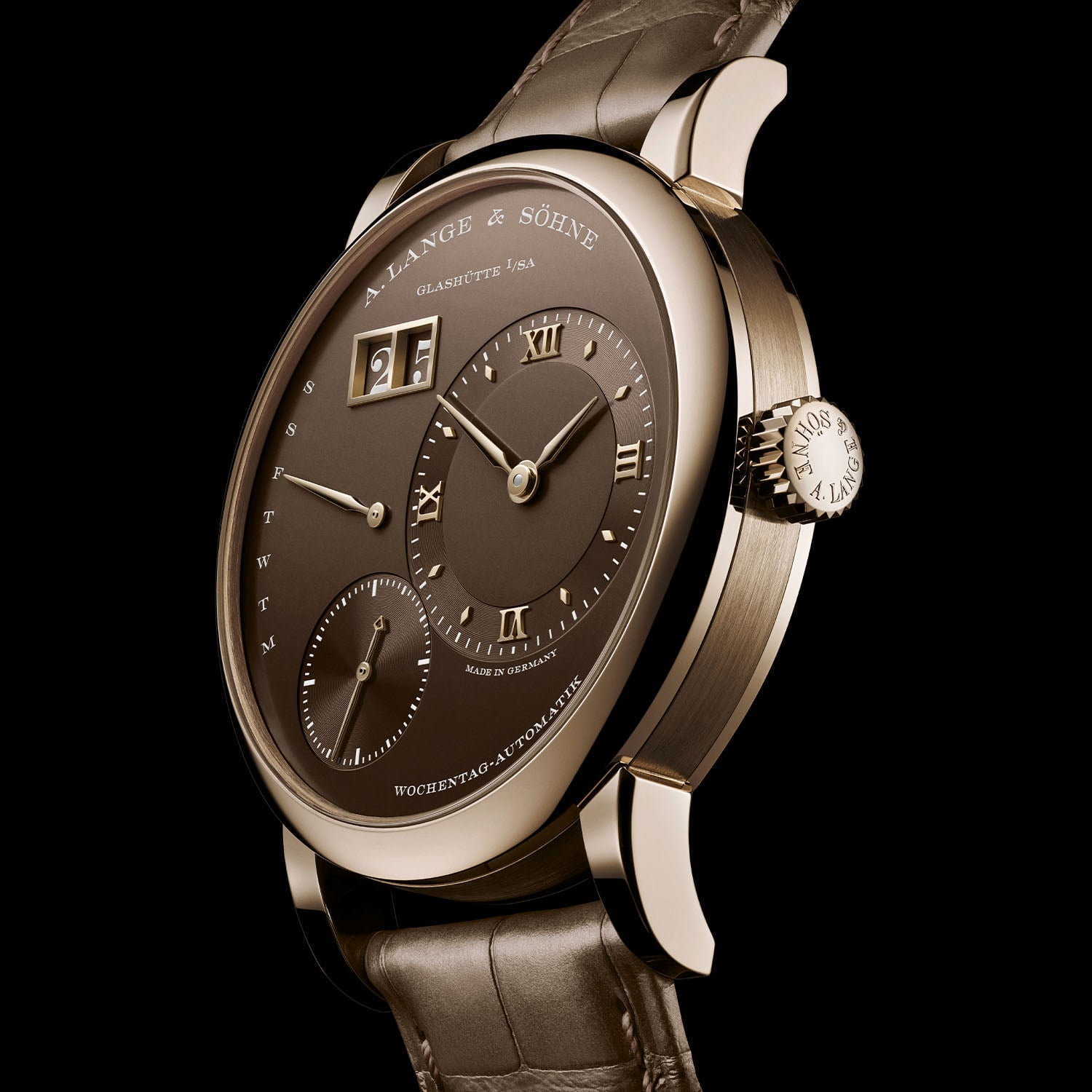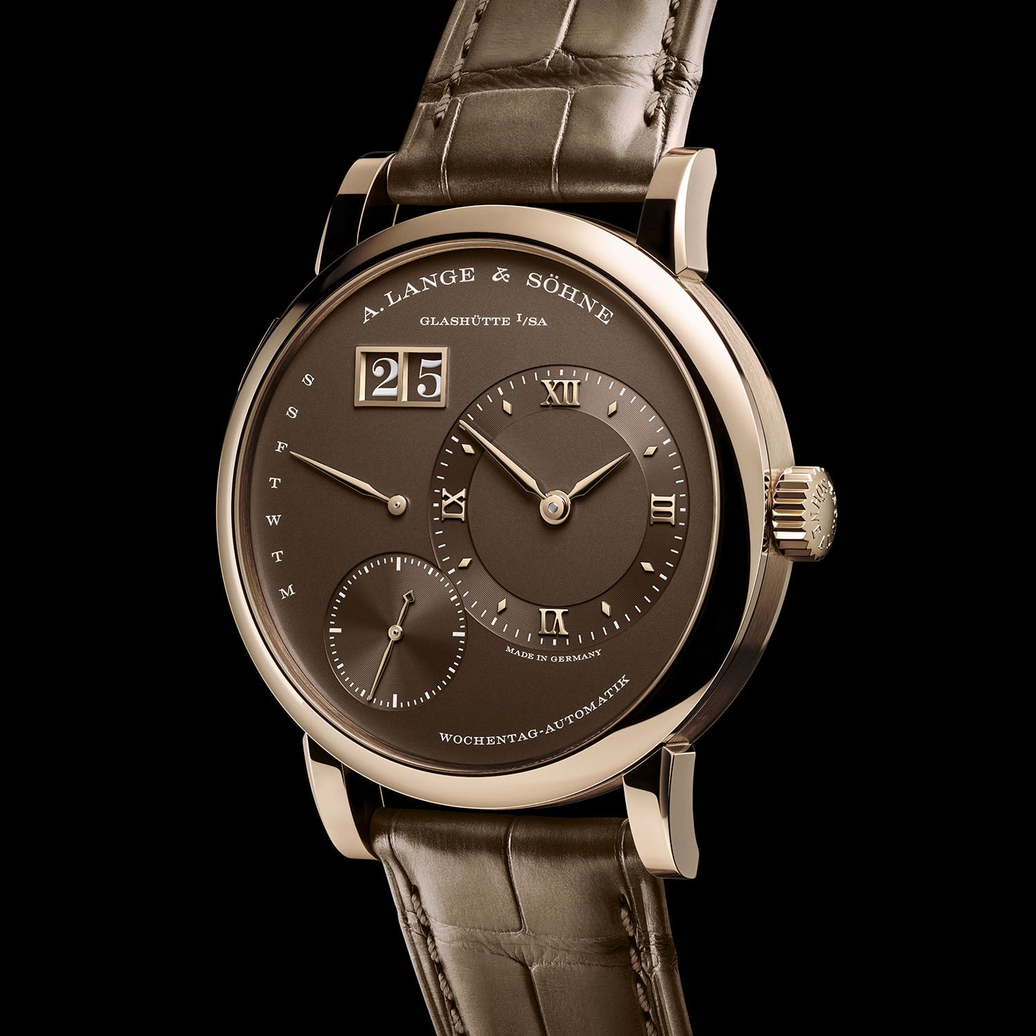 The brown, solid-silver dial harmonises perfectly with the golden case. Its off-centred layout offering the hour and minute subdial positioned on the right, the subsidiary seconds at 8 o’clock, and the signature outsize date at 11 o’clock. The retrograde day-of-week display arcs across the left. Honeygold hands, appliques, and a date frame are in tune with the case’s hue. The white digits on a brown background give the outsize date a distinctive balance. The softly recessed time subdial ring and small seconds enhance visual depth, creating a dynamic effect typical of Lange’s dial design.