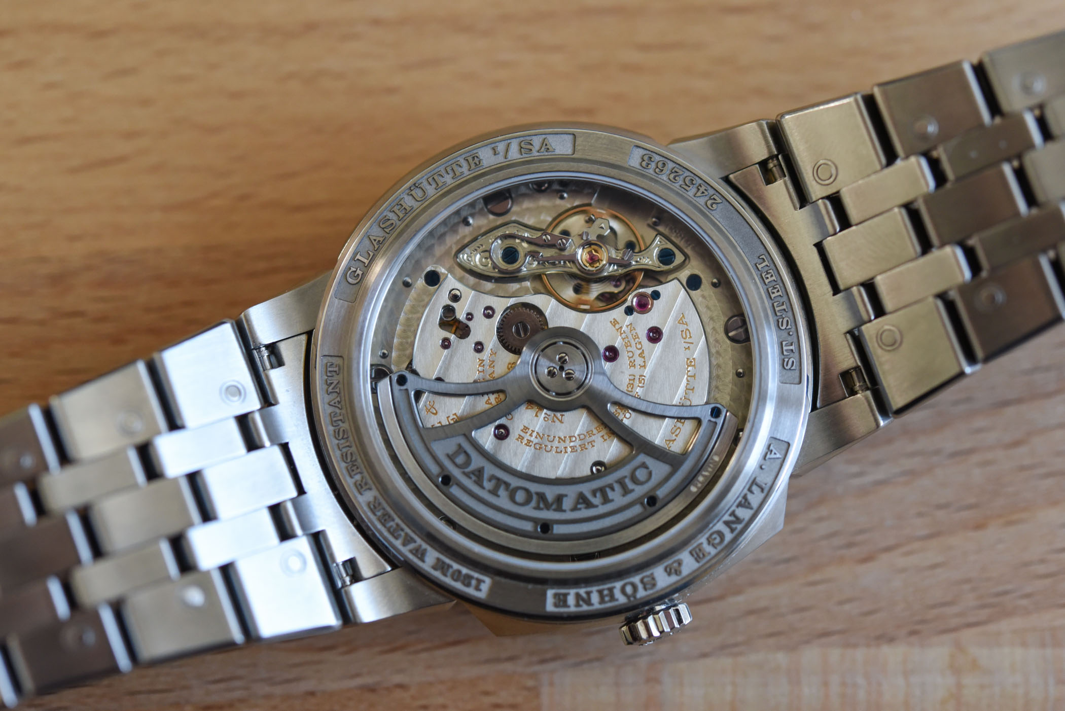 Finally, even though the watch is more casual and cased in stainless steel, the calibre L155.1 Datomatic is finished and decorated in the exact same way as any other Lange movement – meaning at an Haute Horlogerie level, with hand-polished bevels, pèrlage, black polished steel parts, etc.. The modern touch is seen on the rotor, which is coated dark grey and equipped with a heavy platinum mass to provide greater inertia.