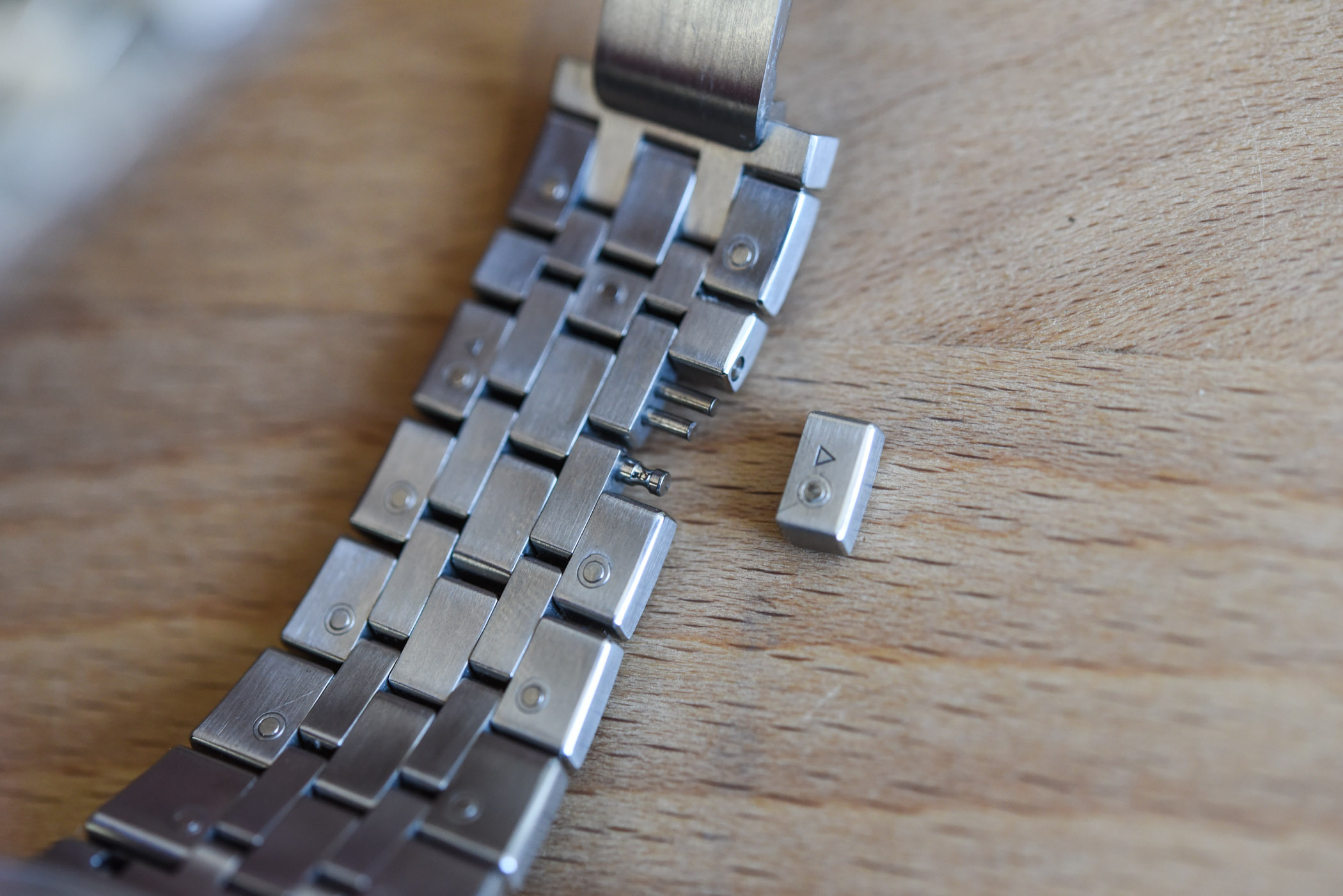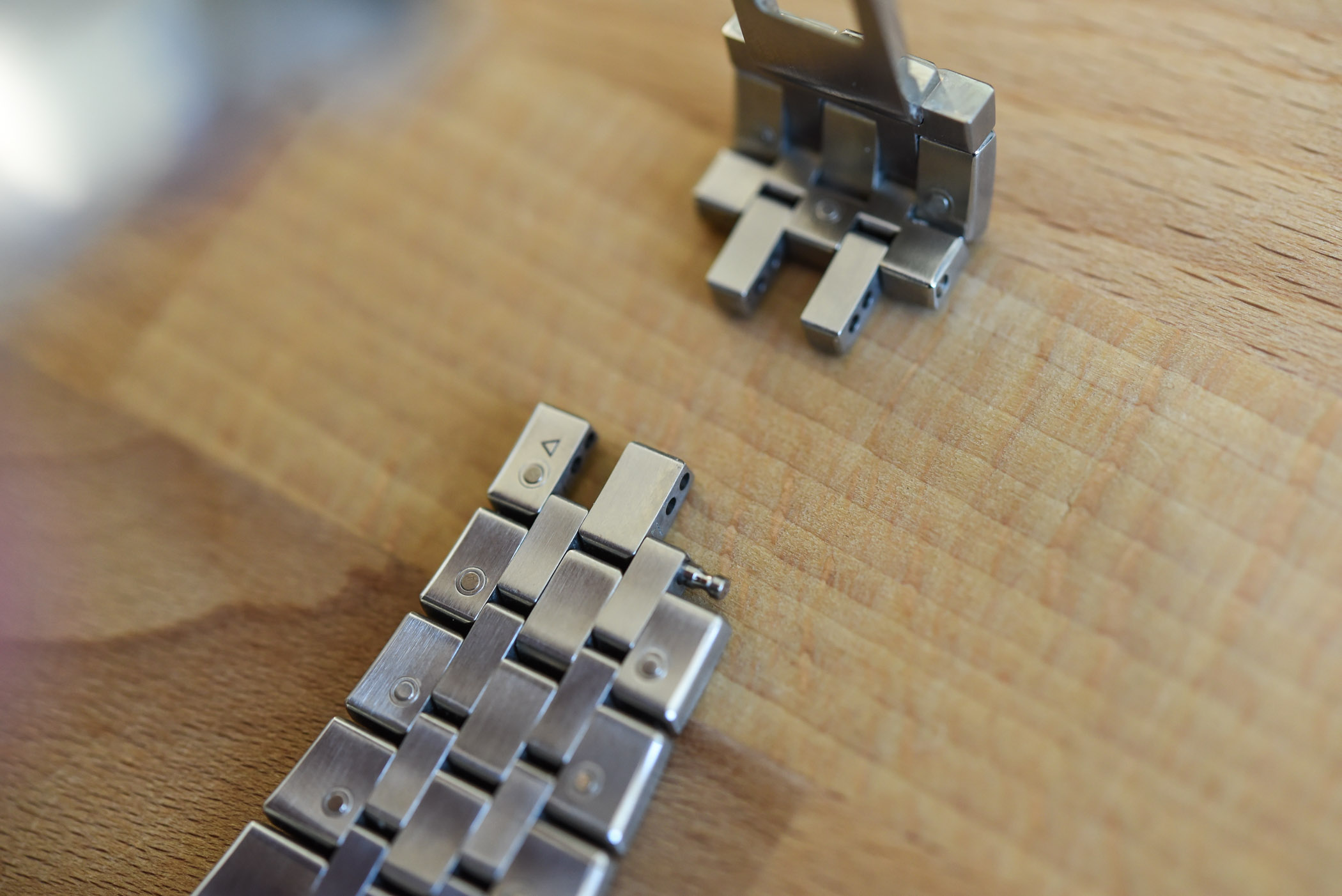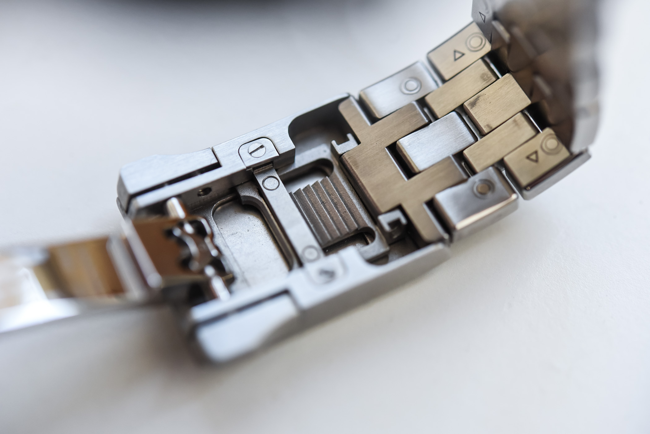 Thanks to the sequence above, you can see the bracelet’s last feature: a self-adjusting system for the initial sizing of the length. Thanks to small recessed pushers on the outer links, and to the tool that is provided by Lange in the box, you can adjust the bracelet to your wrist without having to visit an authorized dealer or a boutique. Certainly, this might seem like quite a complex puzzle at first, but once you’ve digested the user manual, it is pretty easy to do.