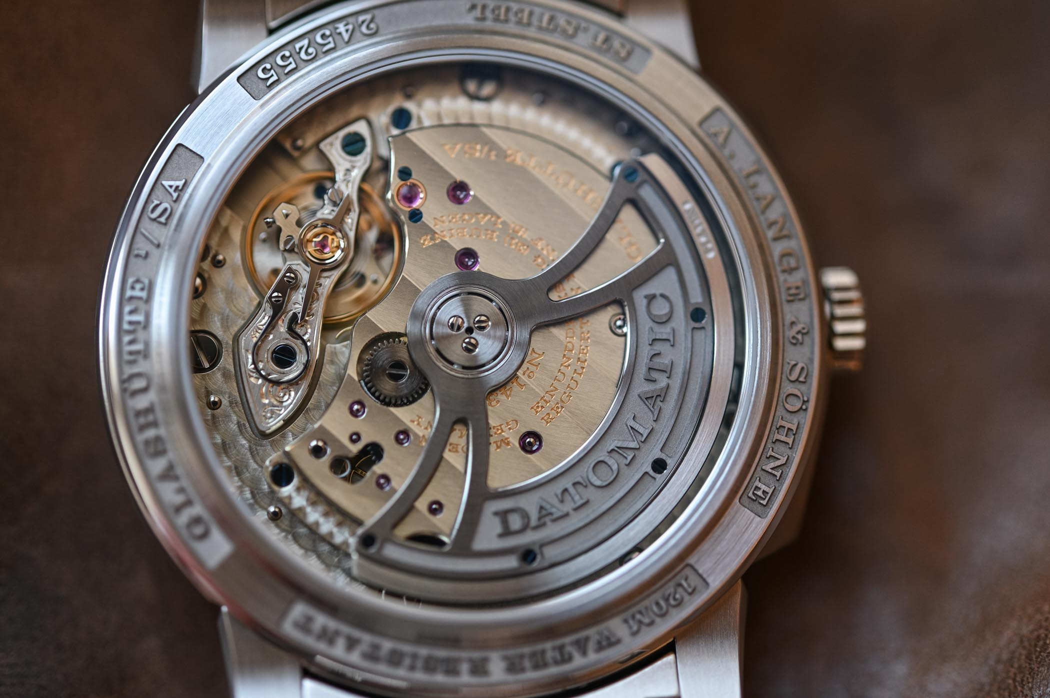 The central rotor, embossed with DATOMATIC, features a platinum centrifugal mass and is open-worked to allow a good view on the nicely finished and decorated bridges. Of course, there’s the large 3/4 plate holding down most of the movement parts, however, there’s something different. The balance is held down by a bridge instead of the usual balance cock: a bridge is held down at two points, while a cock is only held down at one point, again to improve shock-resistance and stability. This bridge is hand-engraved las you would expect from every Lange, however, this time around not with the usual floral decorations but with a ‘wave’ pattern.
