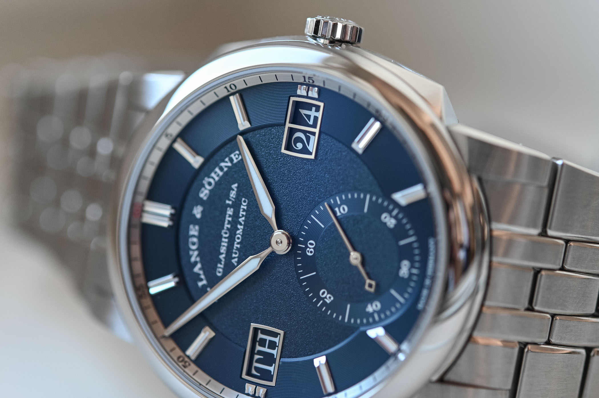 Lange has opted for a deep metallic blue colour, not new to this model, but always superbly executed. This fits the sporty, nautical theme of the watch (and its odd name). Multiple finishings can be seen on this dial: a grained texture in the centre, a concentric pattern on the hours and seconds chapter rings, a metallic brushed surface on the minute flange. Also, it features a small seconds sub-dial, a surprising choice at first, which in fact balances the dial and animates the empty areas.