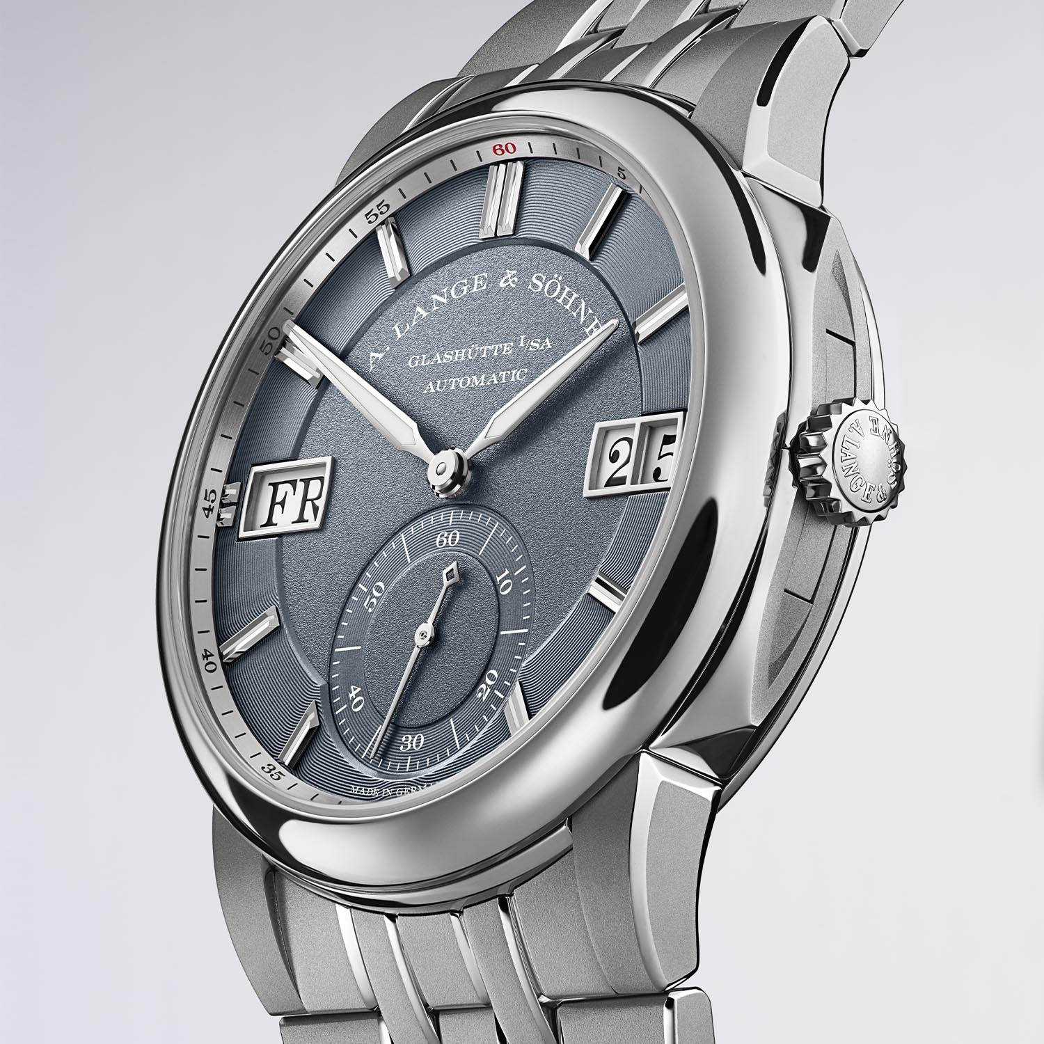 Under the hood is the automatic, in-house Calibre L155.1 Datomatic. A rare element for ALS, it is wound by a central rotor and beats at 4Hz – two specifications that demonstrate the wish for modernity, resistance and practicality. The movement features a cam-poised balance with four poising screws and in-house balance spring. It is also equipped with a transversal balance cock for better shock resistance. And the power reserve is rated at 50 hours. Other than that, it’s typical Lange, with high-end decoration, double assembly and hand-engraved cock. The finishing includes stripes, bevelled edges, blues screws and a skeletonised and partially black-rhodiumed rotor with platinum mass.