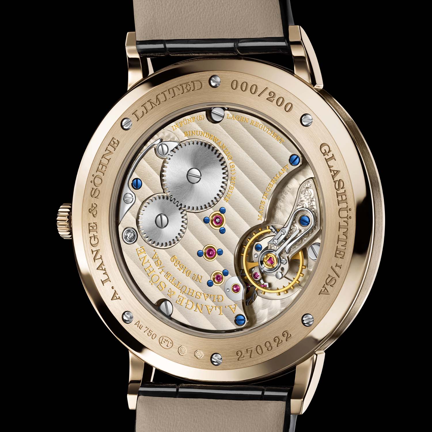 Visible through the sapphire caseback is the manufacture calibre L093.1, Lange’s thinnest movement at only 2.9mm in height. Manually wound, it delivers a solid 72-hour power reserve from a flat mainspring barrel. Every detail is finished to the highest standards: the three-quarter plate in untreated German silver with Glashütte stripes, the hand-engraved balance cock, the three gold chatons secured by blued screws, and the precisely polished bevels and graining. Even a movement reduced to hours and minutes alone is given the same care and artistry as Lange’s most complex complications, including being assembled twice.