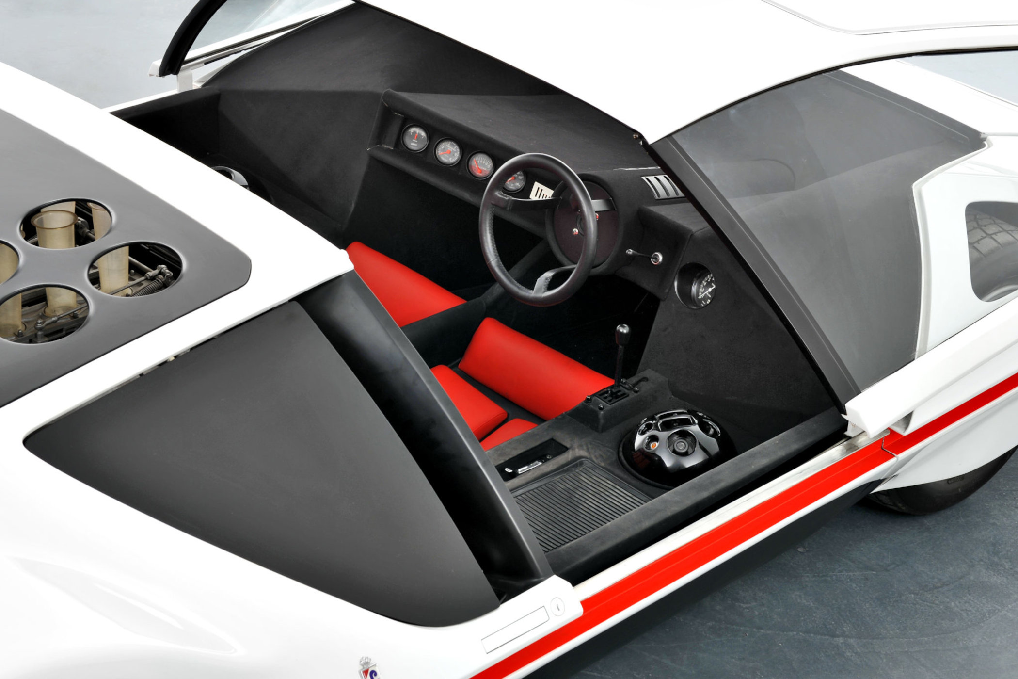 The extremely low car has a glass pane window that opens up to reveal quite a cramped cockpit. The roof/door/windshield gives way to two shaped, leather-clad seats and a fold-away steering wheel. The car has a very sharp frontal area, with the driver’s feet extending past the front axle. The body never exceeds a height of 84cm (or 33 inches). To put this into perspective, the also quite low-slung Ford GT40 is almost 18cm or 7 inches taller. Behind the bulkhead was a 1.6 litre narrow-angle V4 engine, with 115 horsepower on tap. This was hidden from view by a slatted triangular engine cover, which swivels to one side.