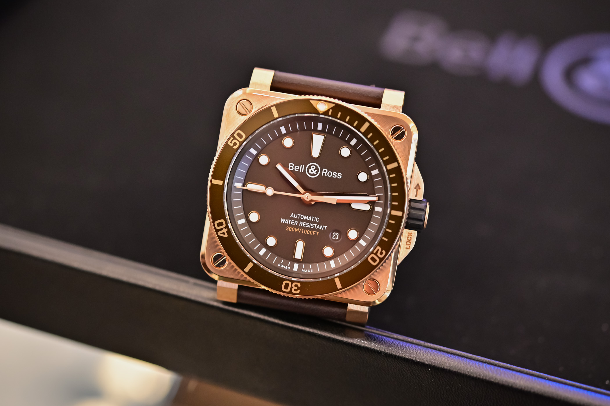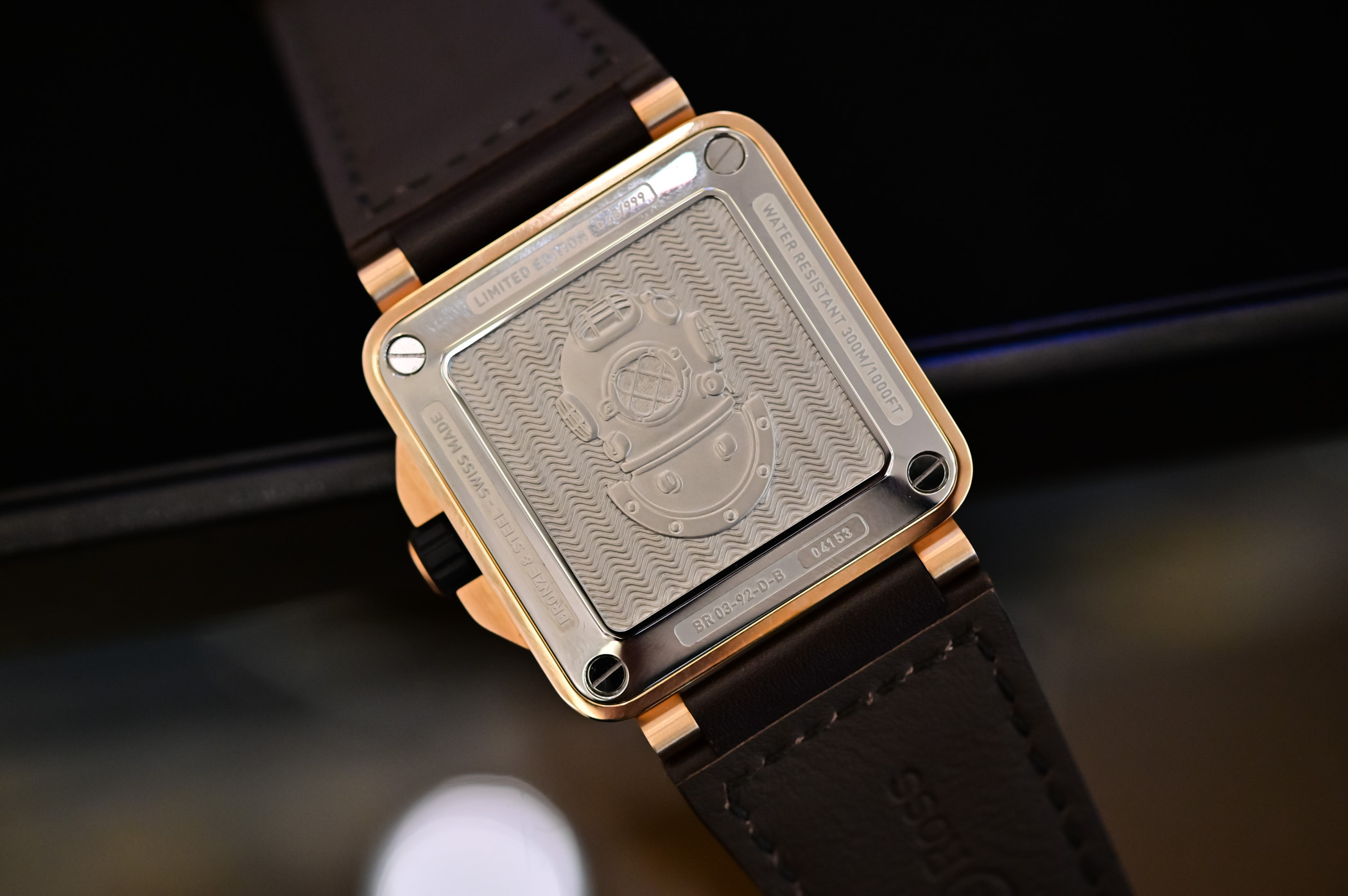 Quick facts – 42mm x 42mm x 12.05mm – square bronze case – unidirectional bezel in bronze with brown anodized aluminium insert – sapphire crystal – solid steel caseback – screw-down crown – 300m water-resistant – matte brown dial – rose gold-plated markers and hands with Super-LumiNova – BR-CAL.302 (Sellita SW 300-1) – automatic winding – 25 jewels – 4Hz frequency – 38h power reserve – hours, minutes, seconds, date – brown calfskin leather strap with pin buckle – limited edition of 999 pieces – EUR 4,500