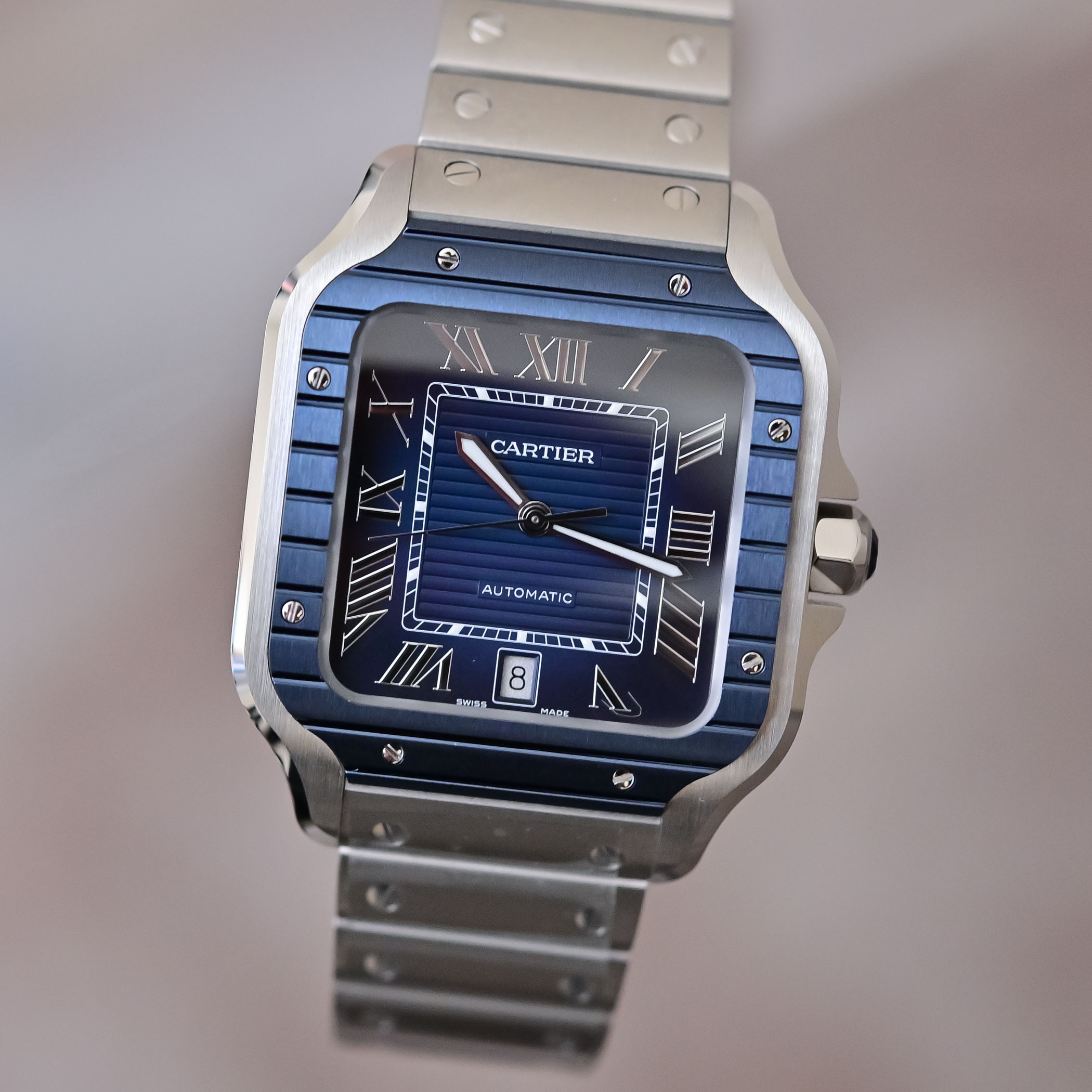 Just like the Monaco, the Santos by Cartier is a true horological legend. First offered for sale in 1911 following a watch created specifically according to pioneer pilot Alberto Santos-Dumont’s wishes, the Santos has always had a square-ish case. It remains a signature collection for Cartier and is still very much relevant today. For 2022 Cartier decided to have a little fun with the icon, and introduce a number of unusual styles. These include a Santos-Dumont with coloured lacquer on the case, and this Santos de Cartier with grooved blue PVD-coated bezel tying in with the blue dial. It comes with the stainless steel bracelet you see here, and an additional blue rubber strap, both fitted with a QuickSwitch interchangeability system. The Santos de Cartier retails for EUR 6,650.