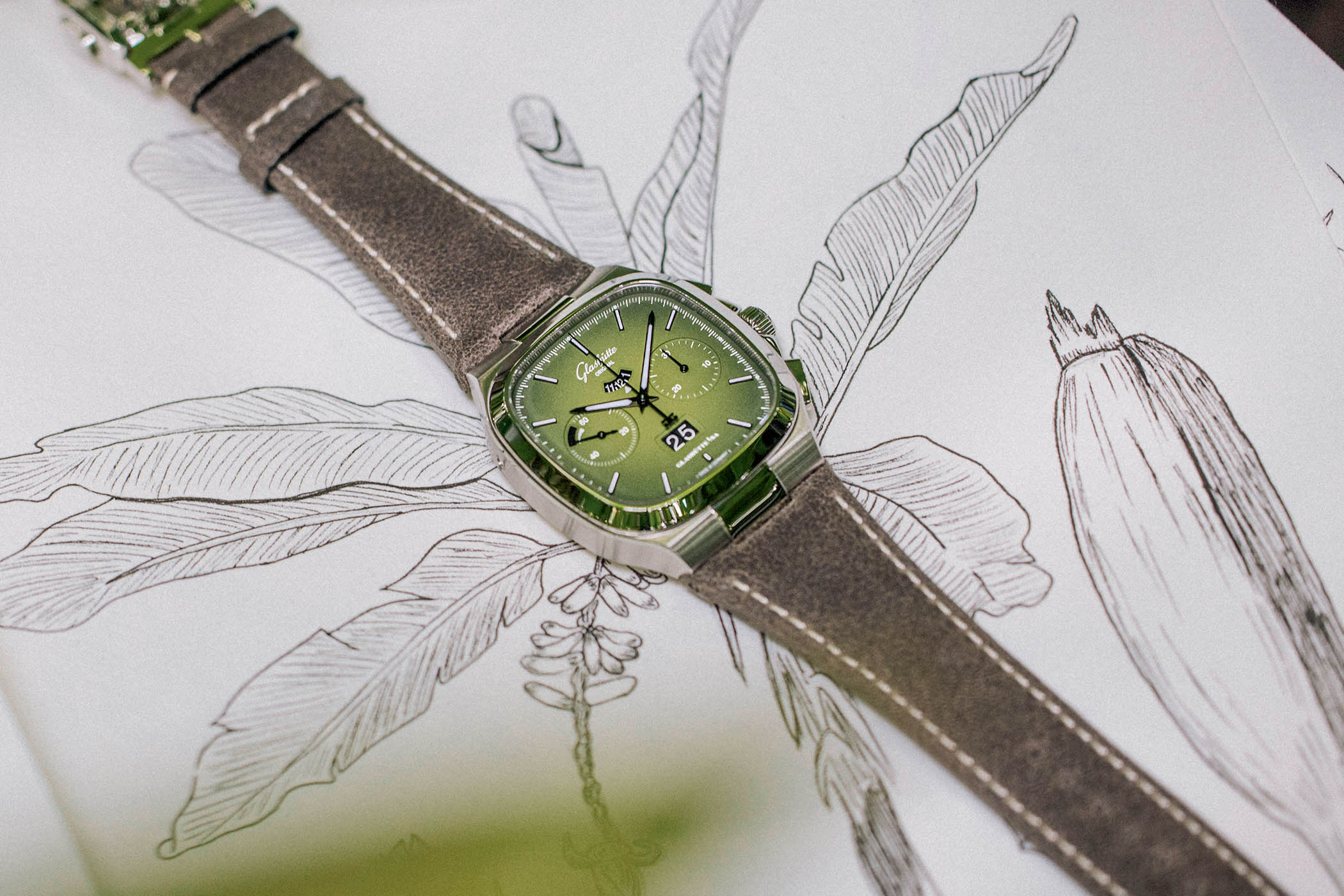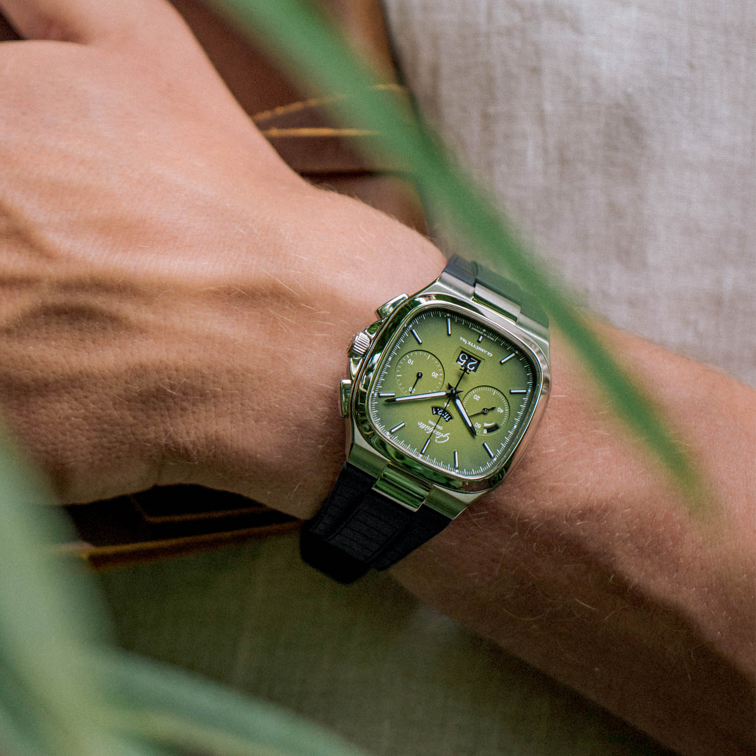 Quick facts – 40mm x 40mm – TV-shaped stainless steel case – sapphire crystal front and back – 100m water-resistant – fab green lacquer dial with degradé – dark-coated appliques – Dauphine hands – Calibre 37-02, in-house – integrated automatic flyback column-wheel chronograph – 65 jewels – 28,800vph – 70h power reserve – hours, minutes, small seconds, power reserve, panorama date, central chronograph seconds, 30-minute counter, 12-hour counter – nubuck strap, rubber strap or steel bracelet – from EUR 13,900