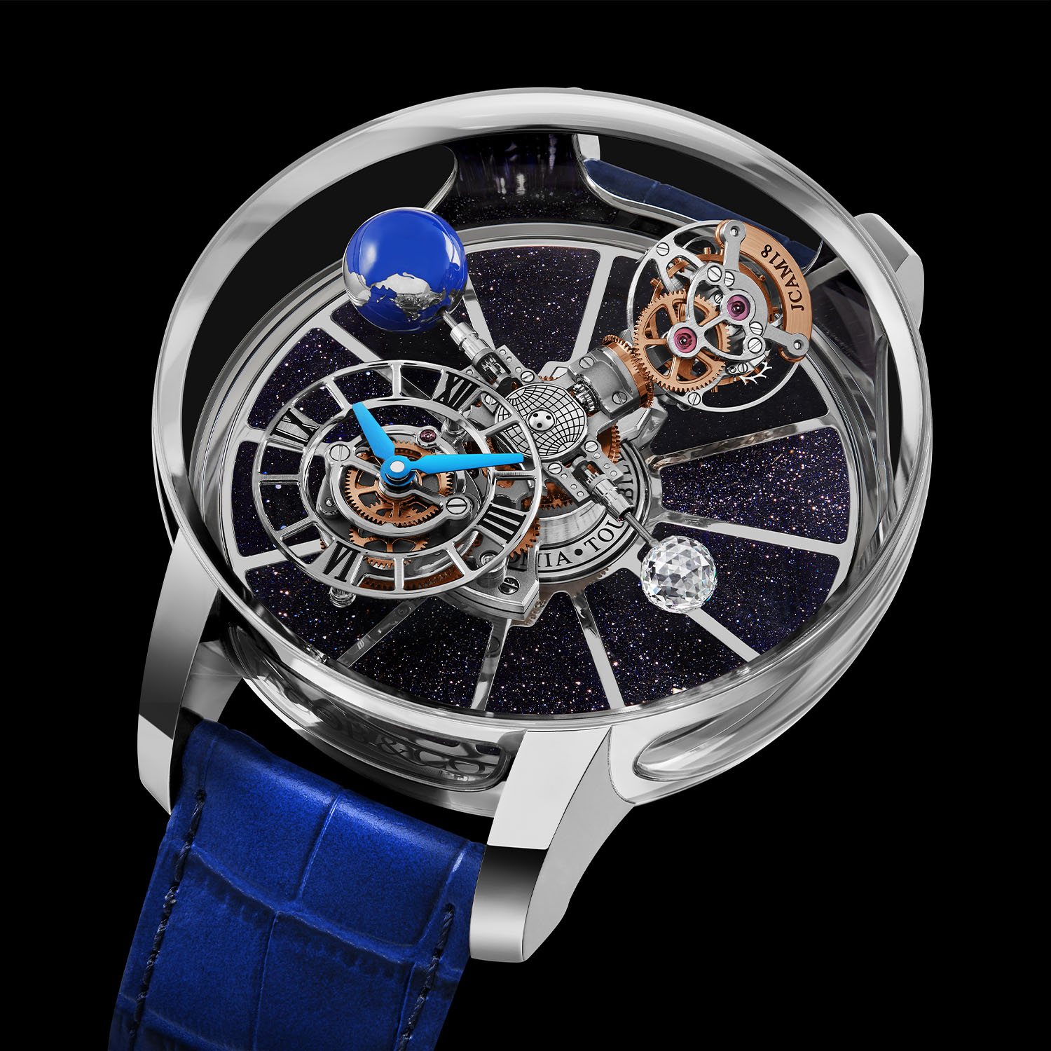 Quick Facts – 50mm x 25mm – 18k white gold case – ultra-domed sapphire crystal – sapphire crystal windows in the caseband – aventurine base dial with white gold “spokes” as hour markers – JCAM10, manual winding – triple-axis tourbillon escapement – revolving skeletonized hour and minute subdial – rotating globe and spherical diamond – caseback with flip-up winders and unique design – unique piece auctioned for charity