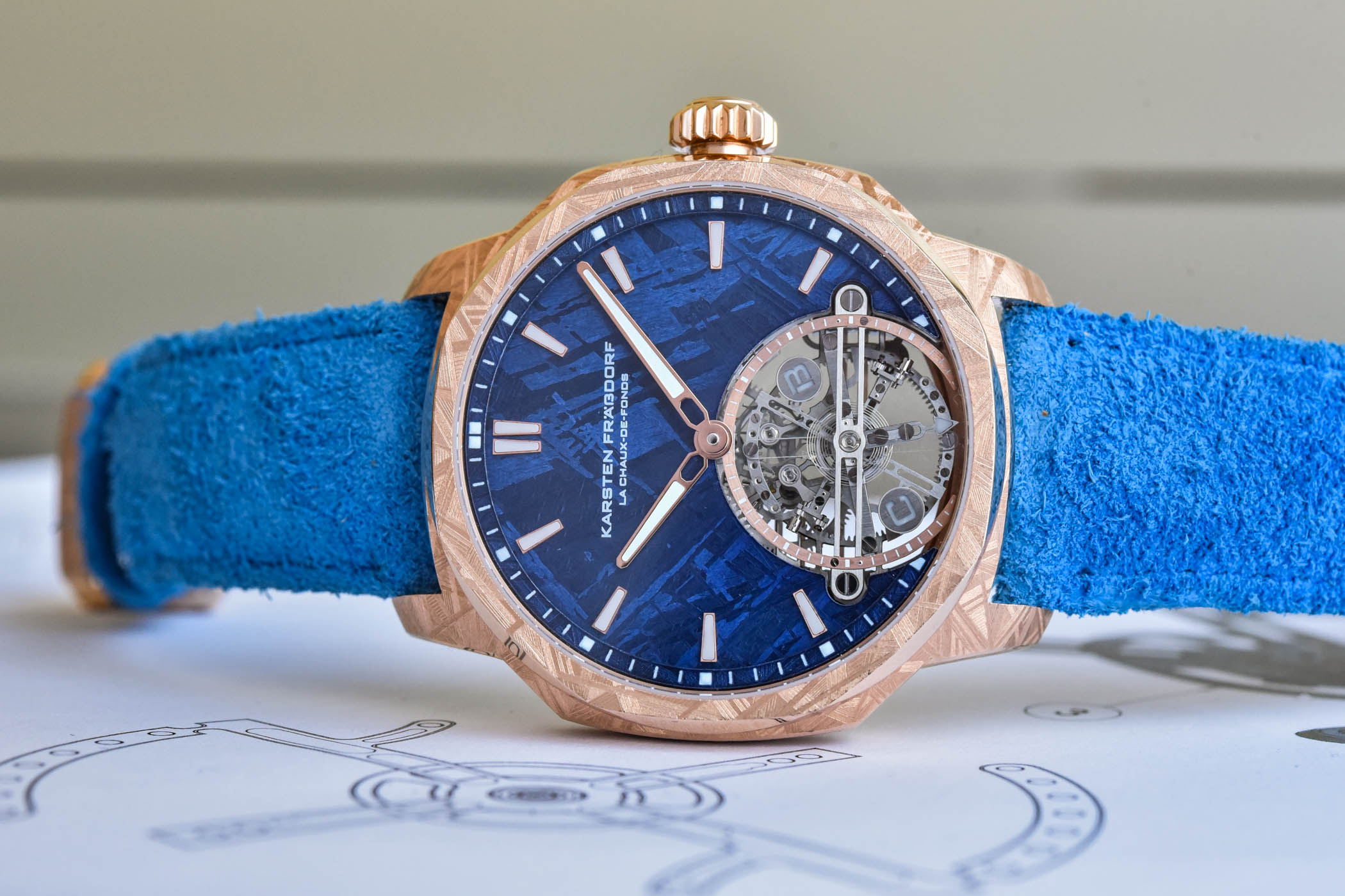 The thing with any Montres KF Ei8ht is that the tourbillon dominates the dial to such an extent it’s difficult to make the rest of the watch equally impactful. However, Karsten Fraessdorf and his team have managed to make that large tourbillon escapement take somewhat of a back seat. The dial for the new Montres KF Ei8ht Evolution is made of meteorite and is available in a whole range of colours, including silver, blue and brown. The surface pattern of the meteorite dial is then carried over to the 44.5mm wide stainless steel or rose gold case with a special engraving. Turning the watch over reveals the honeycomb mainplate of the Novamag 01. This extraterrestrial watch is made to order, with vast customization options available.