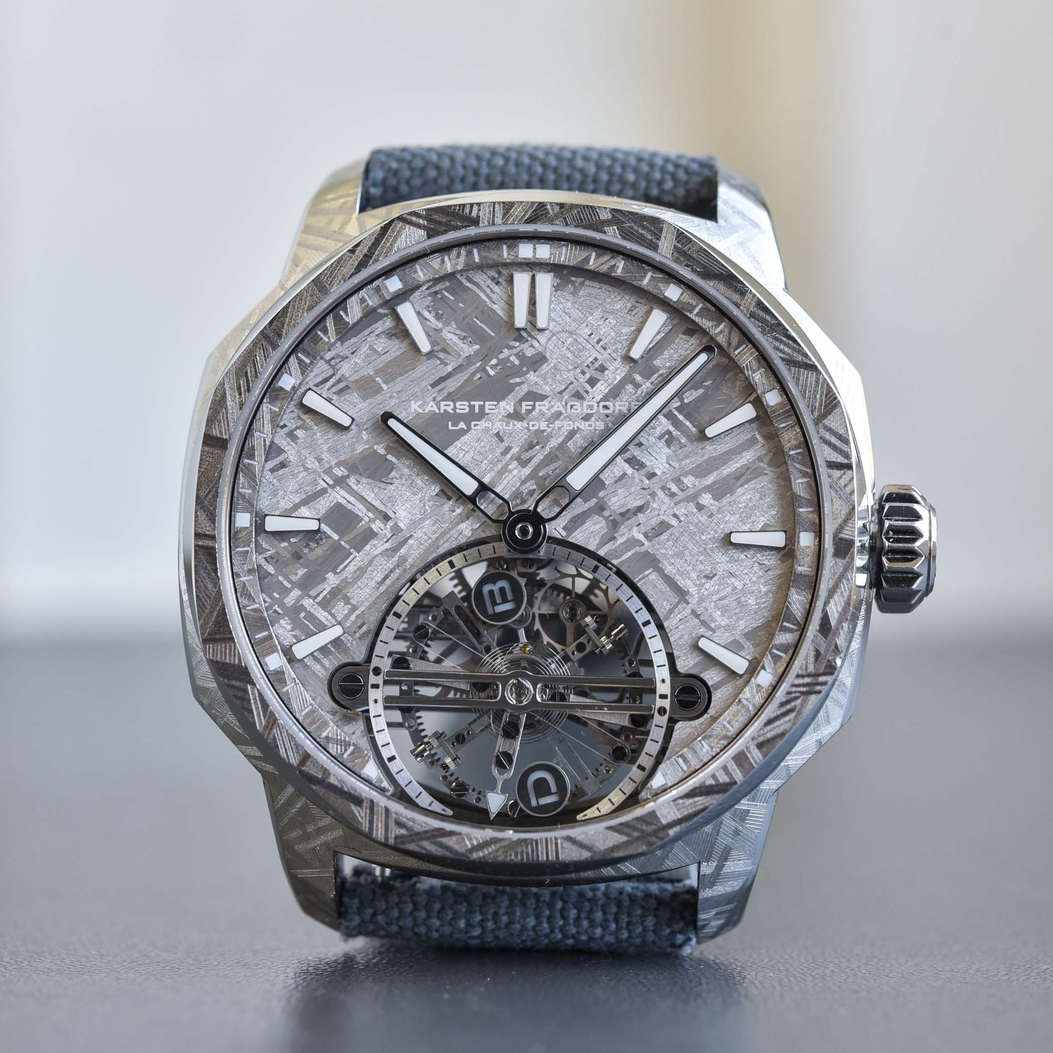 Quick Facts – 44,5mm x 12.2mm – engraved stainless steel or rose gold case – sapphire crystal on both sides – 50m water-resistant – meteorite dial in different colours – applied hour markers and hands with luminous material – Calibre Novamag 01, made in-house – hand-wound – 42 jewels – 18,000vph – 66h power reserve – hours, minutes, seconds on the one-minute tourbillon – leather strap of your choice with triple-folding buckle – EUR 128,000