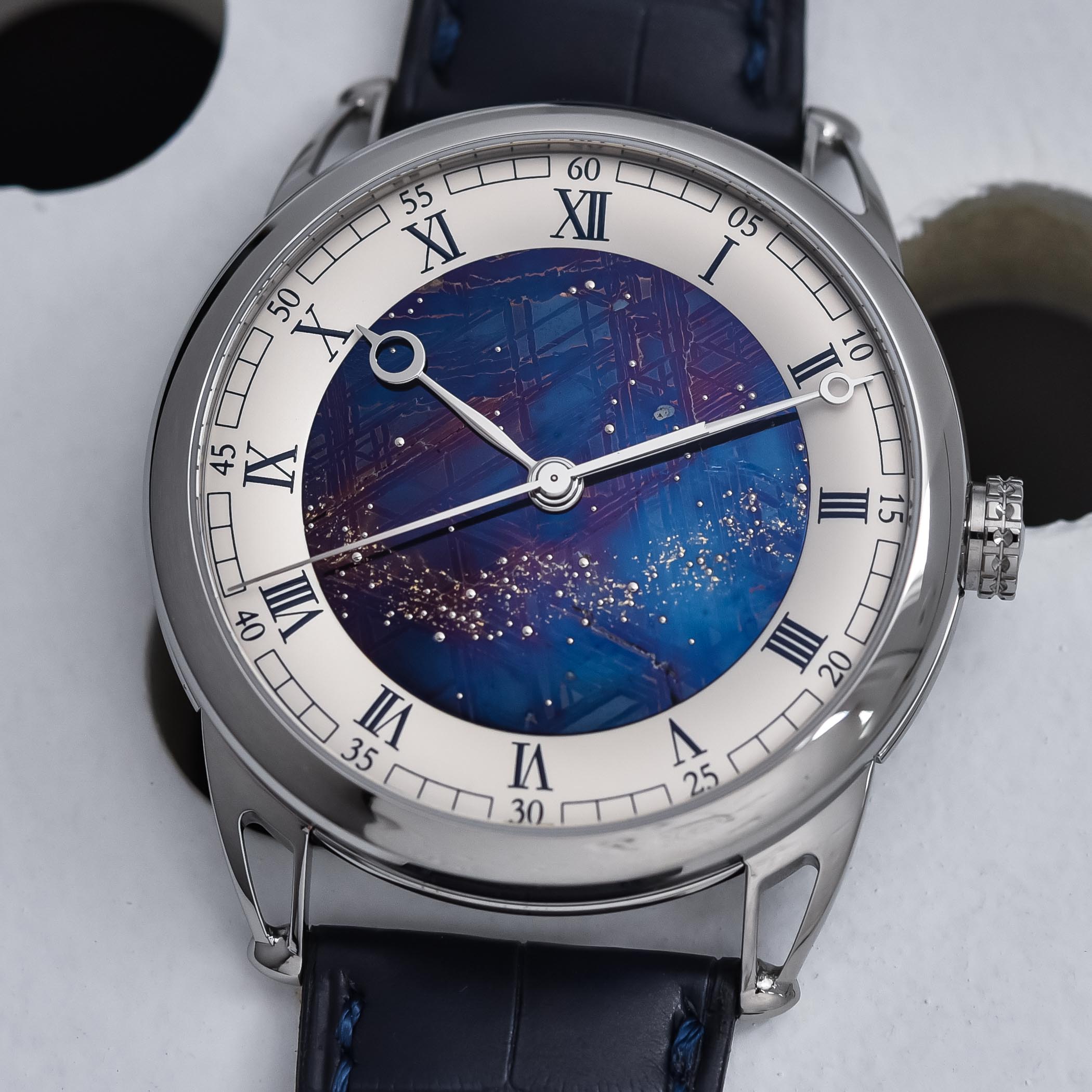 Quick Facts – 45,5mm diameter – multi-part stainless steel case – sapphire crystal front and back – 50m water-resistant – hammered blue or golden-brown dial to reproduce the surface of Mars – genuine Martian meteorite fragment in anodized aluminium container – PVD-treated indices – partly skeletonized hands – Calibre LM45, developed and manufactured with Concepto – automatic winding – 22 jewels – 28,800vph – 48h power reserve – hours, minutes, small seconds – blue or black alligator leather strap with folding buckle – limited to 100 pieces – CHF 17,000