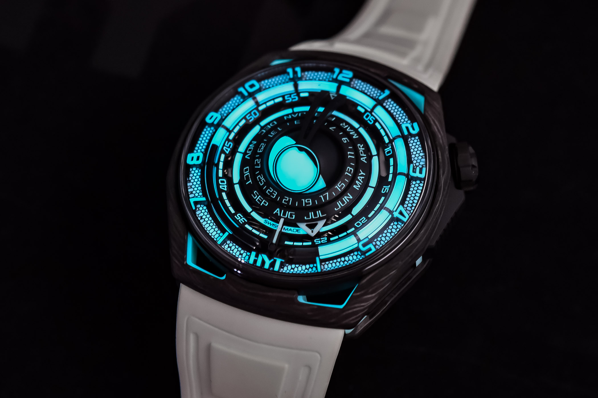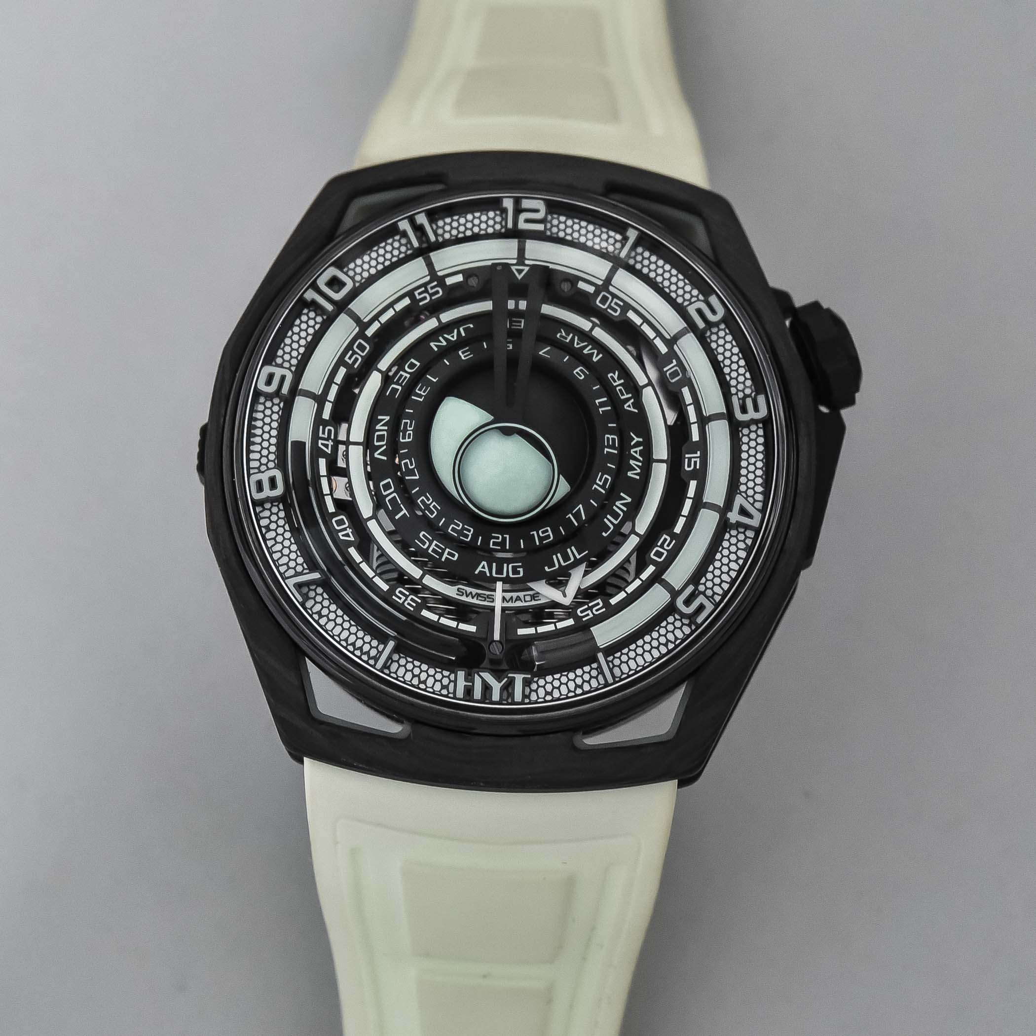 Quick Facts – 48mm x 52.30mm x 21.80mm – 64-part hydrocarbon & TecLight® case with black-coated titanium crown – domed sapphire box crystal and sapphire crystal caseback – 50m water-resistant – fluidic hour indication – applied Lumicast hour numerals – white luminous background – rotating Lumicast minute hand – luminous months and date display – spherical revolving luminous moon display – Calibre HYT 601-MO – hand-wound – 516 parts – 41 jewels – 28,800vph – 72h power reserve – retrograde fluidic hours, minutes, months, date, spherical moon phase – T-light white rubber strap with black-coated titanium buckle – limited to 10 pieces – EUR 130,000