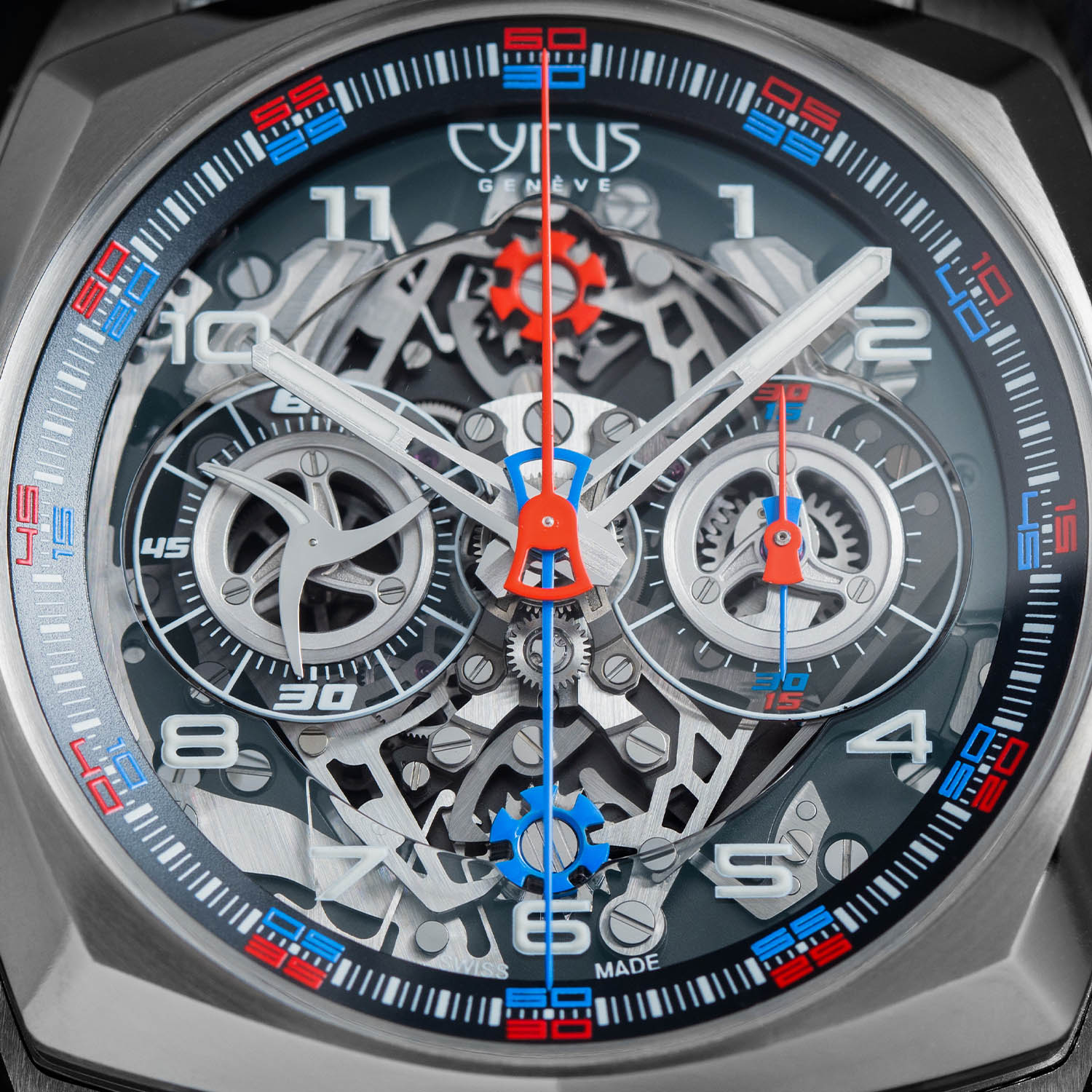 Presented in 2021, the Cyrus Klepcys Dice (acronym of Double Independent Chronograph Evolution) is a double monopusher chronograph capable of measuring two time intervals independently. The watch’s double chronograph module is positioned dial side. It brings together two sets of wheels, springs, levers and, of course, two column wheels that each activate one of the chronographs. To make sure that legibility remains optimal, Cyrus plays with two distinct colour schemes – on the hands, on the crowns, on the column wheels and the corresponding tracks. The starting points of the chronograph hands are mirrored: one starts at 12 o’clock the other one at 6 o’clock.