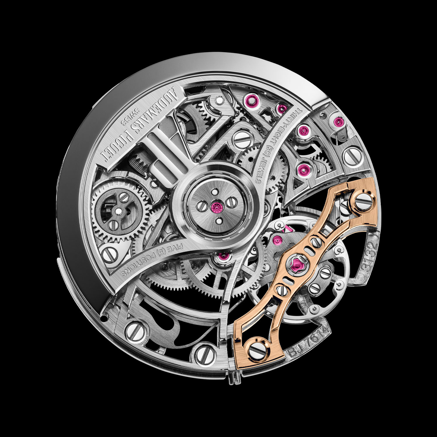 Introduced in 2016, the dramatic Royal Oak Double Balance Wheel Openworked showcases many components of the calibre 3132 on the dial. The showstopper, though, is the spectacle of the two balance wheels, each with its own hairspring, connected by a single balance staff.