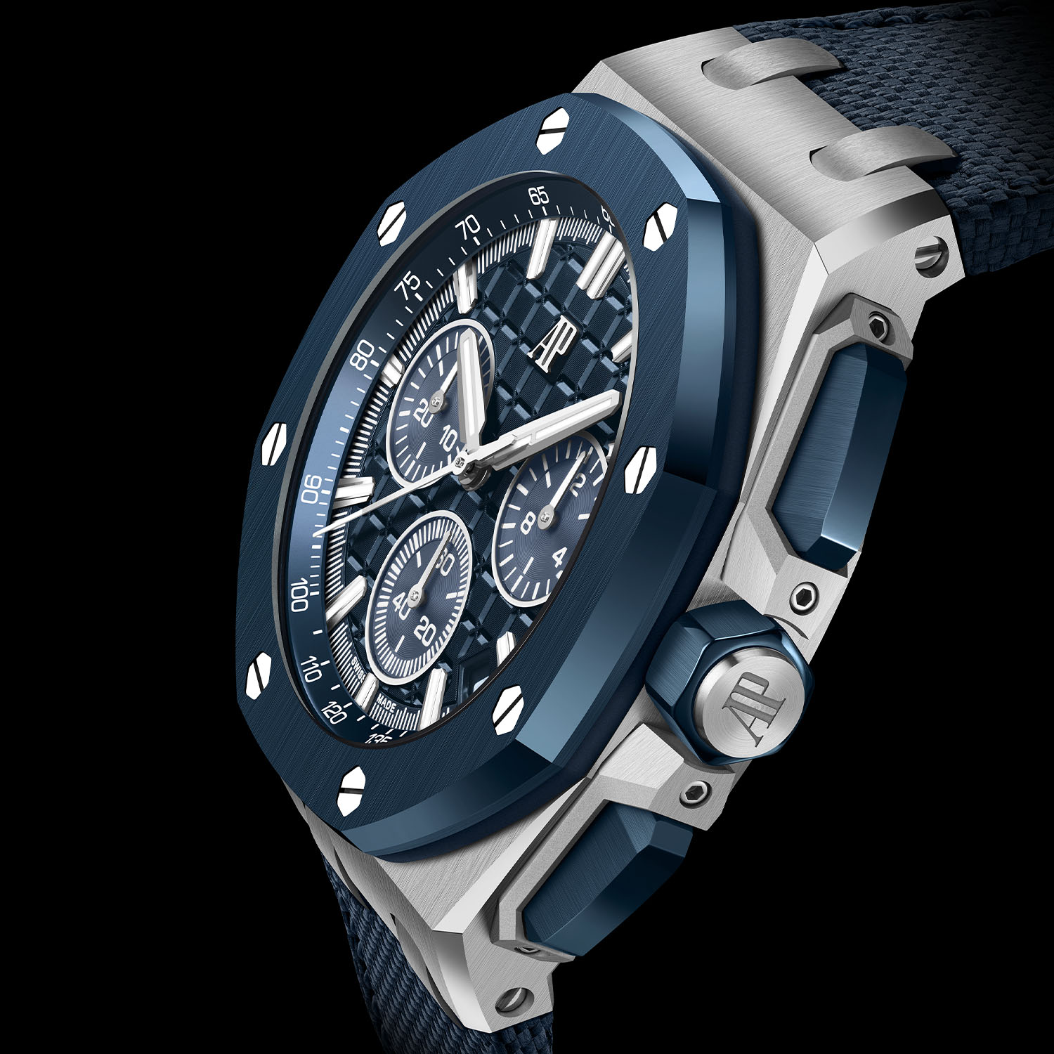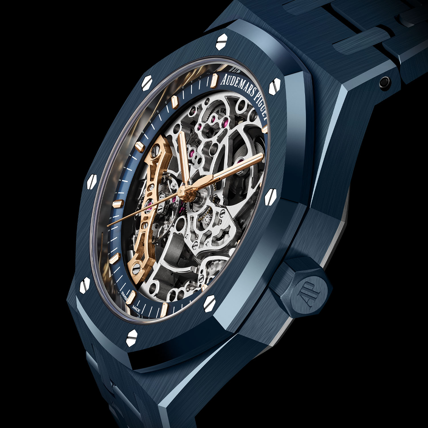Audemars Piguet recreates a colour intimately associated with its first Royal Oak model of 1972. Although the colour described as “Bleu Nuit, Nuage 50” has appeared on many dials, it has never been replicated in high-tech ceramic. Inspired by the clear night skies of the Vallée de Joux, this darker tone of blue ceramic is used on the three models – two Royal Oak Offshore Chronographs and a Royal Oak Openworked Double Balance.