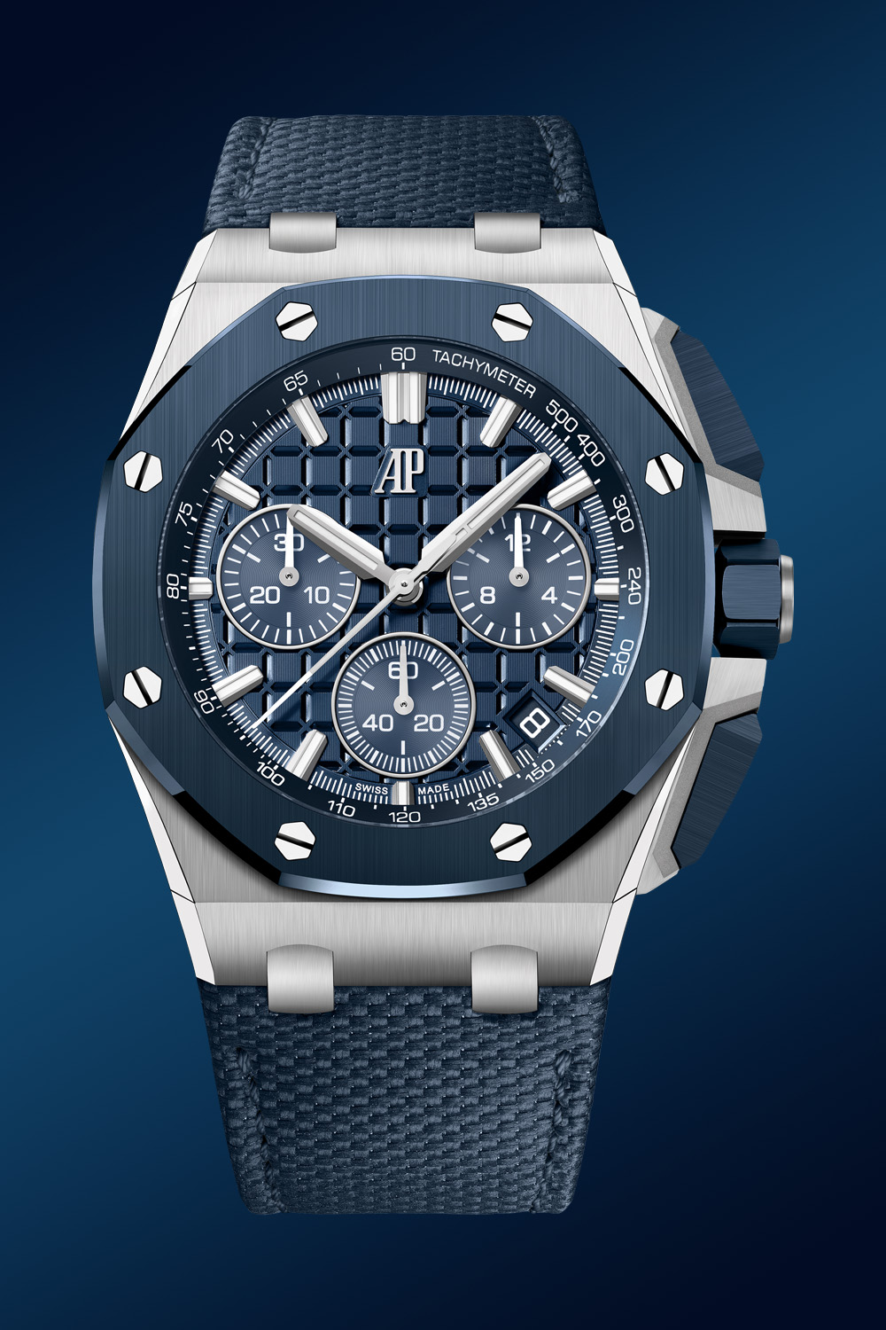 Audemars Piguet’s blue ceramic pays homage to the famous “Bleu Nuit, Nuage 50” tapisserie dial selected by Gérald Genta for the dial of the first Royal Oak in 1972 (reference 5402ST). Made by Geneva dial maker Stern, the dark blue “Bleu Nuit, Nuage 50” colour was obtained by adding black pigment no.50 to the protective varnish. The nuage or cloud effect was a chemical reaction produced by the small amount of black pigment poured into the liquid lacquer. Today, the distinctive in-house colour used on dials is obtained using a PVD process.