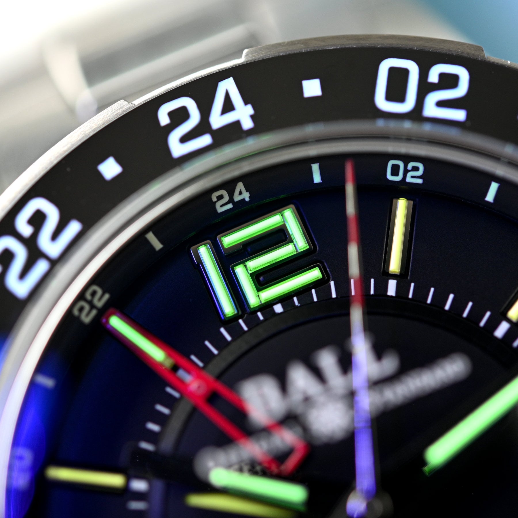 Tritium has an assortment of coloured glows available, particularly with GTLS tubes. The brightest and consequently most popular is green, but there’s white, blue, orange, purple and yellow, with the latter three being the dimmest and used more for aesthetics. Most of the daytime colours (the paint without the glow) are either off-white/cream or pale yellow. Going back to Ball Watch Company, the Fireman Night Train III has an astounding 61 tritium tubes on the dial – one per hand (three total) and 58 around the dial in multiple glowing colours. In fact, buyers can even choose the lume colours, such as yellow hands with orange indices and blue markers, or the same setup with green indices and so on. Ball’s Engineer III Marvelight Chronometer Meteorite 40mm has 15 tubes with six different colours on the dial – yellow for the three hands and green, white, yellow, blue, orange and purple indices (a pattern repeated twice with green at 12 and 6 o’clock).