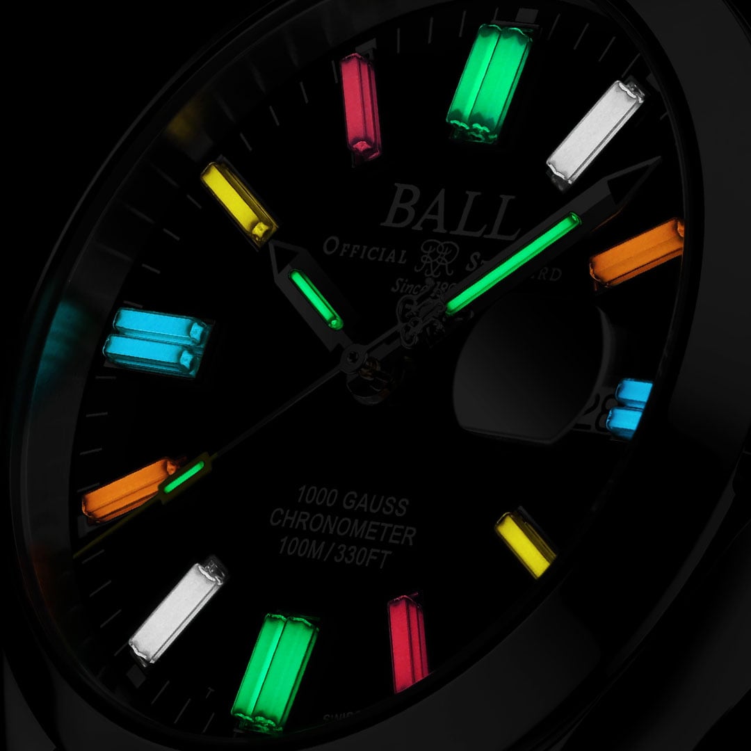 An improved albeit rarer form of tritium on watch dials is tritium tubes, and they’re even popular today. Instead of paint mixed with tritium and zinc sulfide, tiny glass vials are sealed with tritium gas and a powdered phosphorescent coating, which creates a continuous glow for up to 25 years without the need for external light for a charge. The tubes are brighter and more reliable than tritium paint and pose virtually no risk from the sealed radioactive material. The overall method is similar to the paint counterpart, as beta particles in the tritium gas react with the internal phosphor coating (in the same way as zinc sulfide). The tubes are known as Gaseous Tritium Light Sources (GTLS), and Ball Watch Company is a true GTLS pioneer and among the first to embrace these gas tubes.