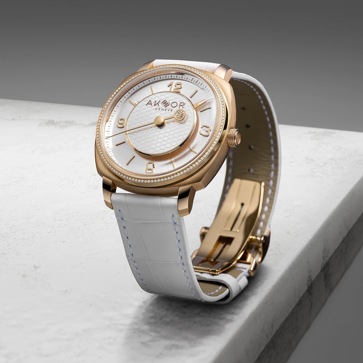 Both Lumière Blanche editions are worn on a hand-stitched white alligator strap, secured by a folding clasp matching the case material. Prices are CHF 57,800 or CHF 67,800 (with diamonds), including taxes. For more information, please visit www.akhor.ch.