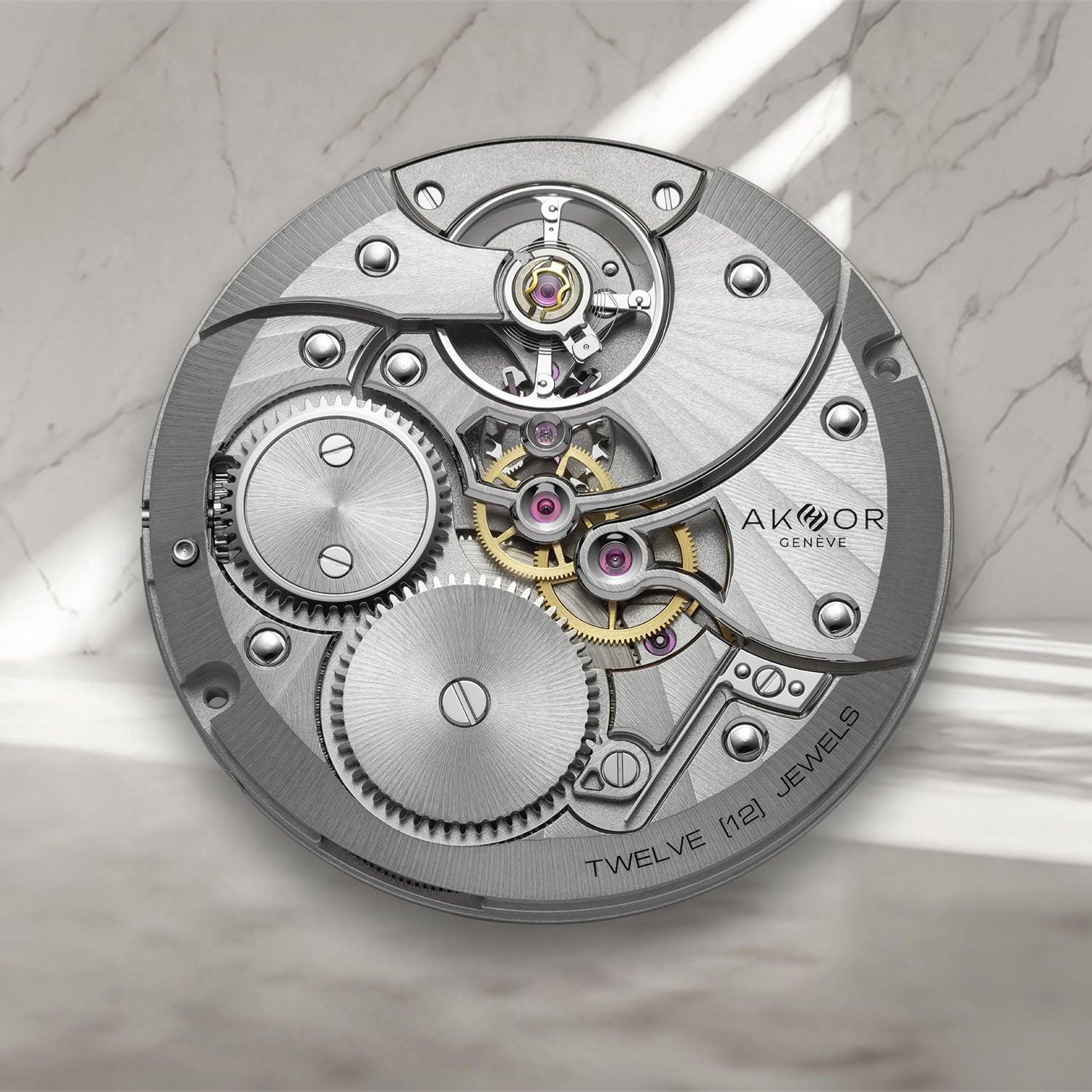 The watch is powered by the manual-winding calibre AK10, developed exclusively for Akhor and manufactured by Clamax. Measuring 31.3mm in diameter and 3.9mm thick, the COSC-certified movement operates at 28,800 vibrations/hour and delivers a 60-hour power reserve from a single barrel. Comprising 117 components, the movement features a variable inertia balance and a stop-seconds mechanism. Finishing includes hand-applied anglage, fan-shaped Côtes de Genève and decorated wheels. The distinctive screw heads mimic the case’s cushion profile.