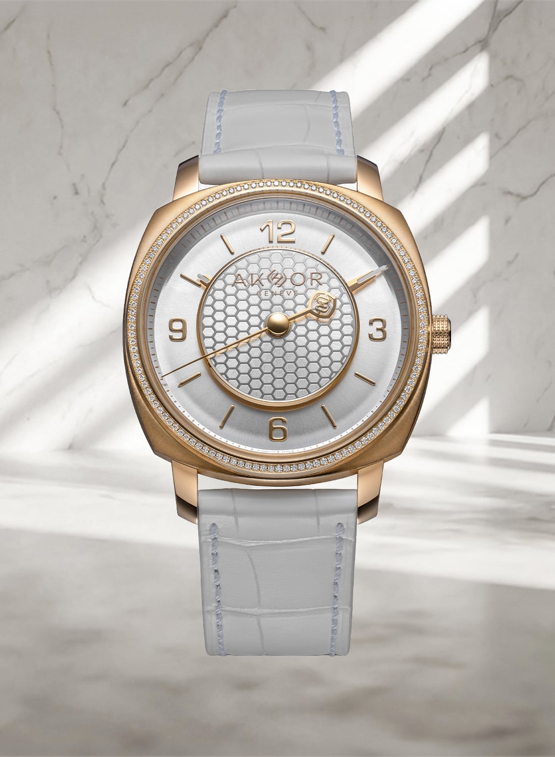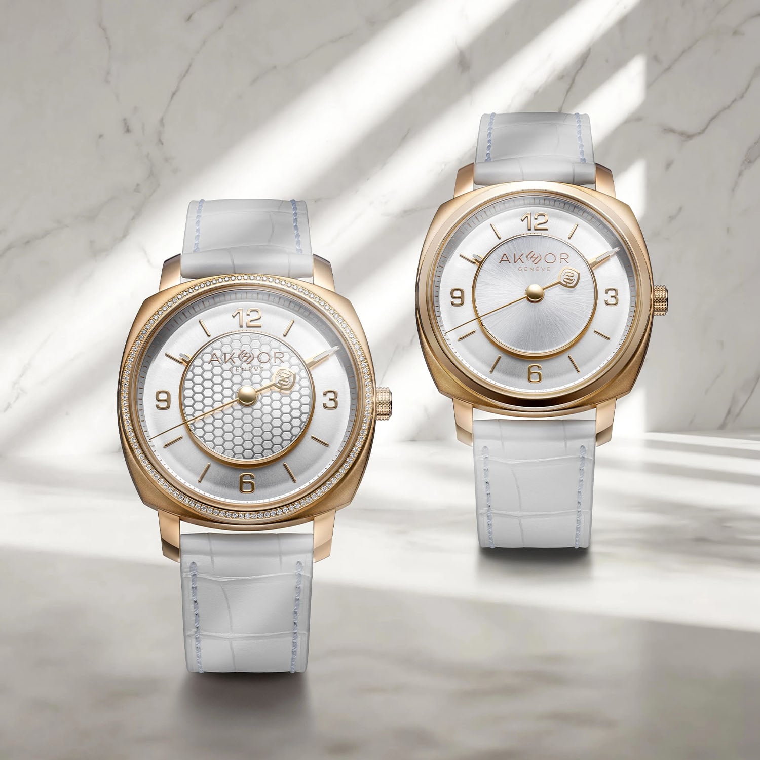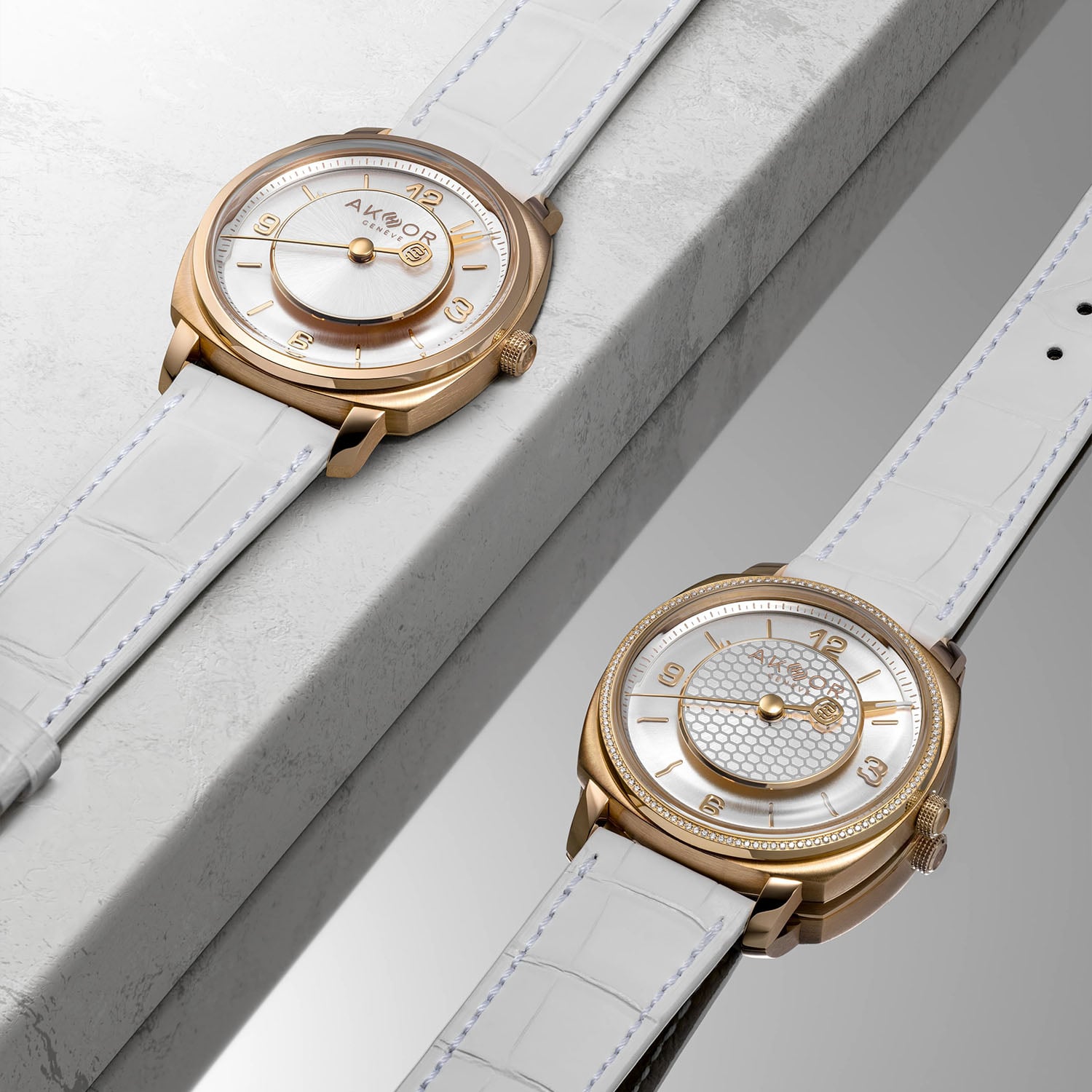 Both Lumière Blanche editions are worn on a hand-stitched white alligator strap, secured by a folding clasp matching the case material. Prices are CHF 57,800 or CHF 67,800 (with diamonds), including taxes. For more information, please visit www.akhor.ch.