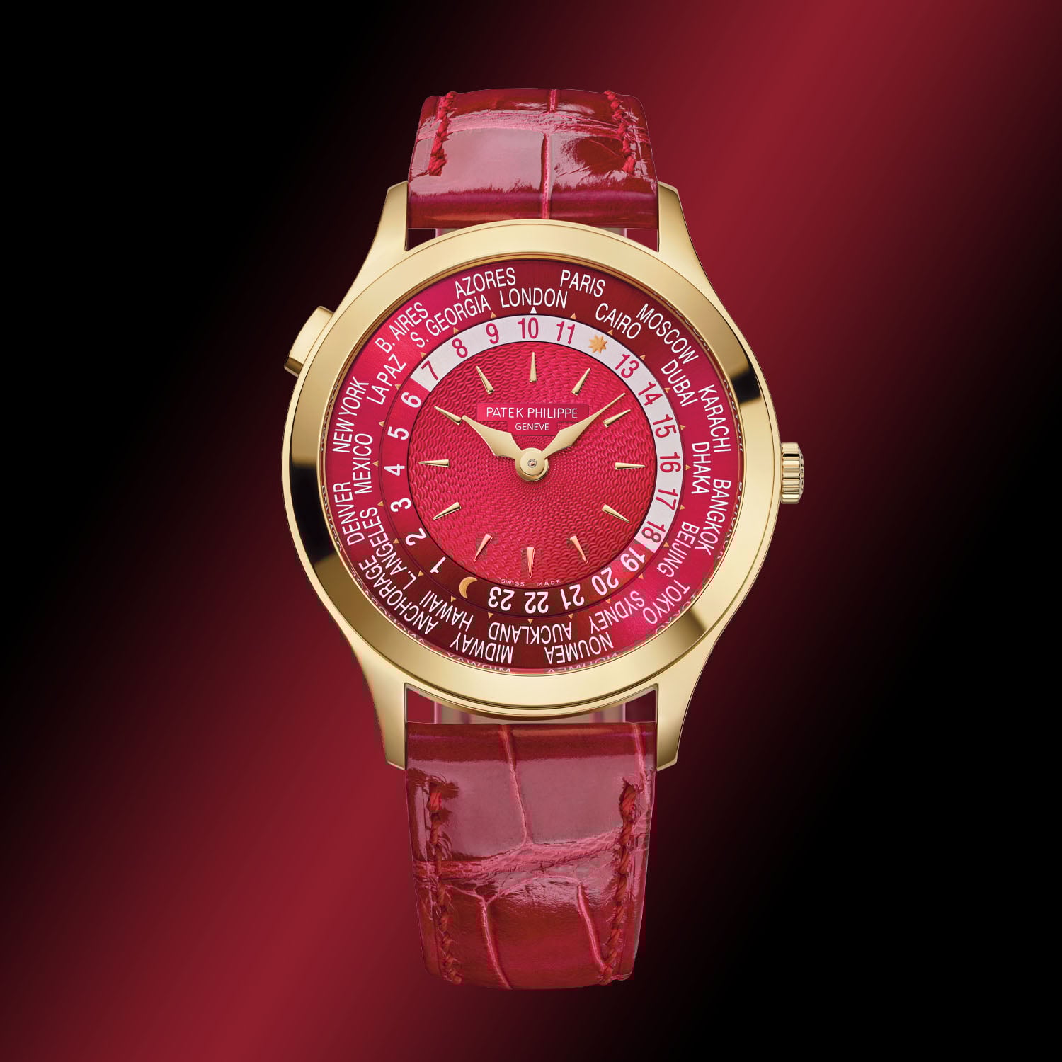 A yellow gold 36mm worldtimer with a carmine red dial. The centre part of the dial is hand-guilloché with an old-basket weave motif. Calfskin strap in matching colour. Price is set at CHF 46,000.