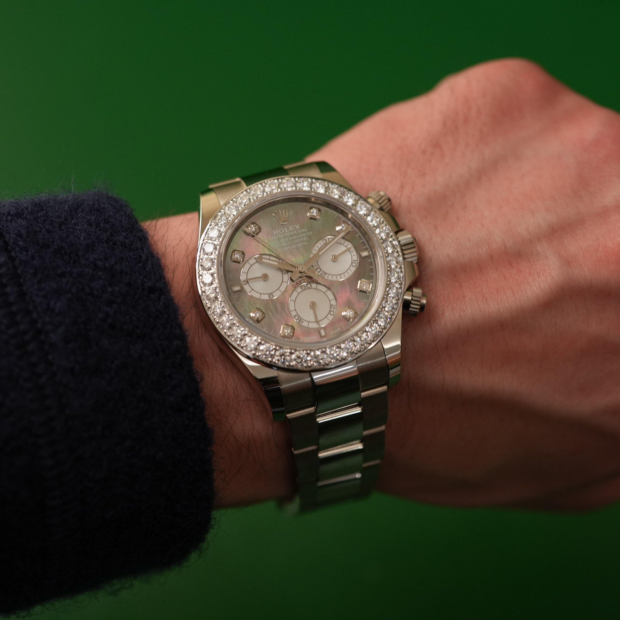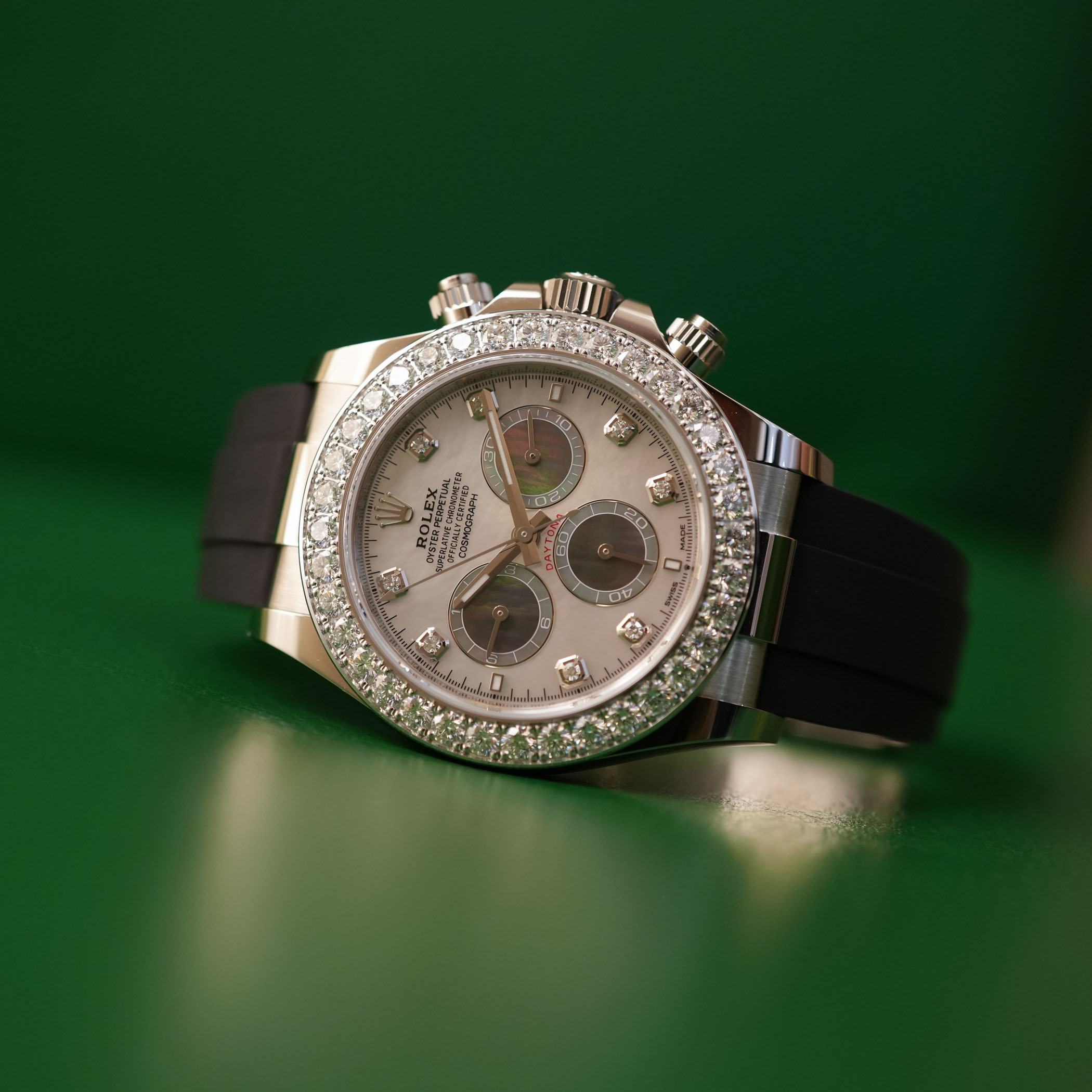 Two white gold editions, with 36 diamonds on the bezel, featuring a white or black MoP dial and stones on the markers too. High-end, jewelry-oriented additions to the revamped collection of 2023.