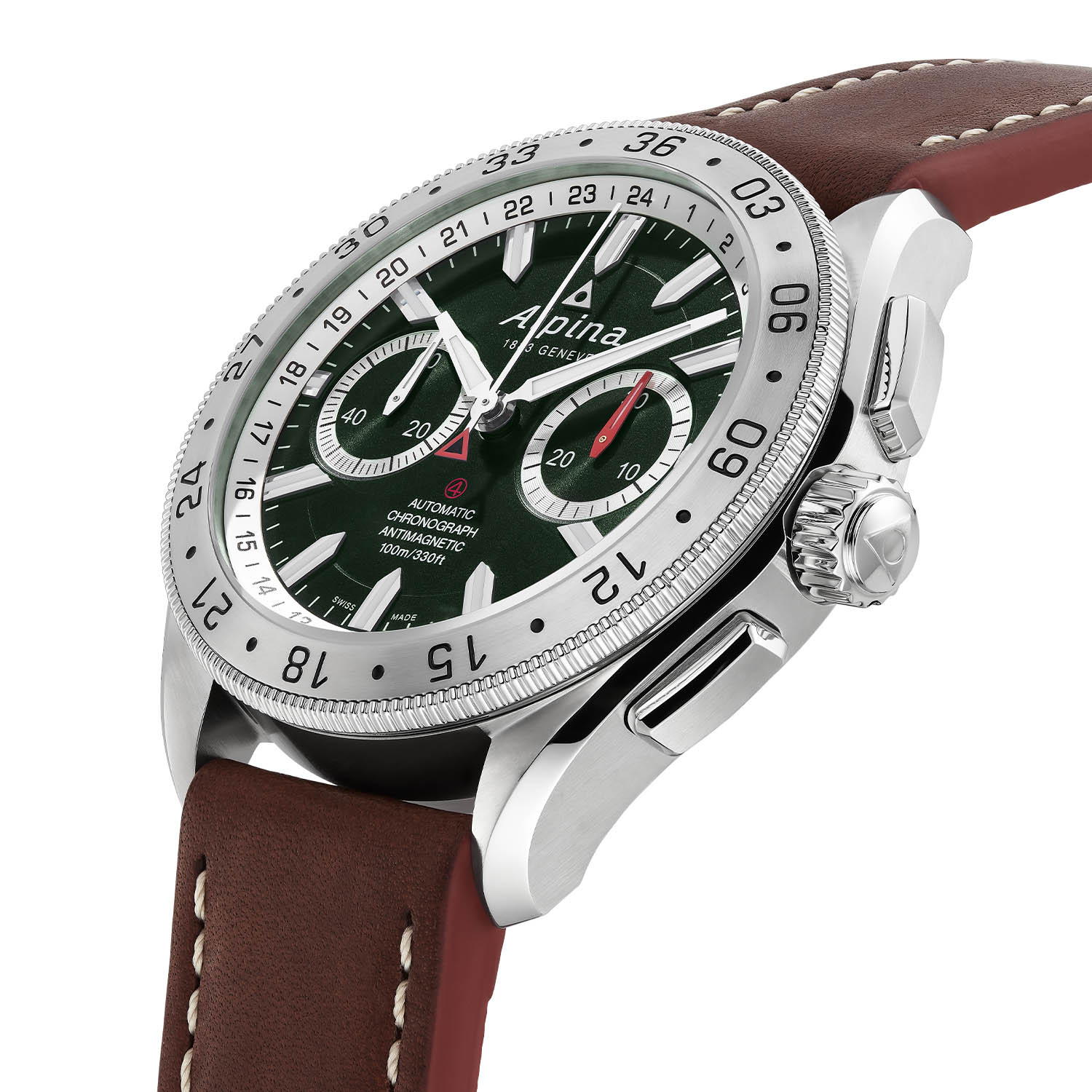 Beneath the sealed caseback engraved with the silhouette of the Alps is the automatic chronograph calibre AL-860. Based on the Sellita SW500 chronograph movement, the AL-860 features a bi-compax counter configuration and a no-date display. Beating at 28,800vph, the movement delivers a 55-hour power reserve.