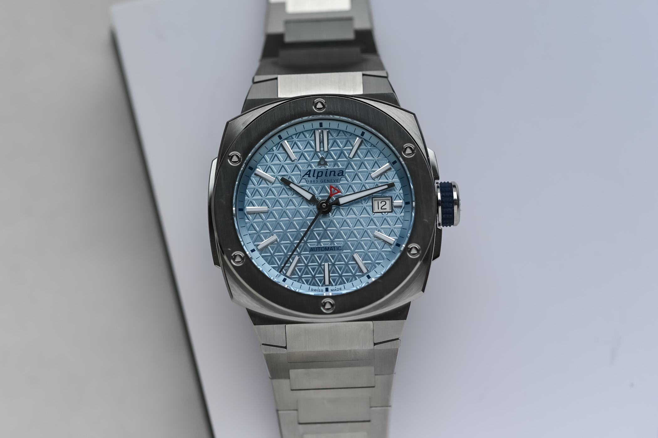 The ice blue satin-finished dial features Alpina’s signature triangle pattern, framed by a blue outer ring with a minutes/seconds track. Applied silver-tone indices, filled with white lume, ensure readability, while polished silver hands – also luminescent – enhance visibility in low light. A red triangle counterweight on the seconds hand adds a sporty touch. The date window at 3 o’clock completes the functionality.