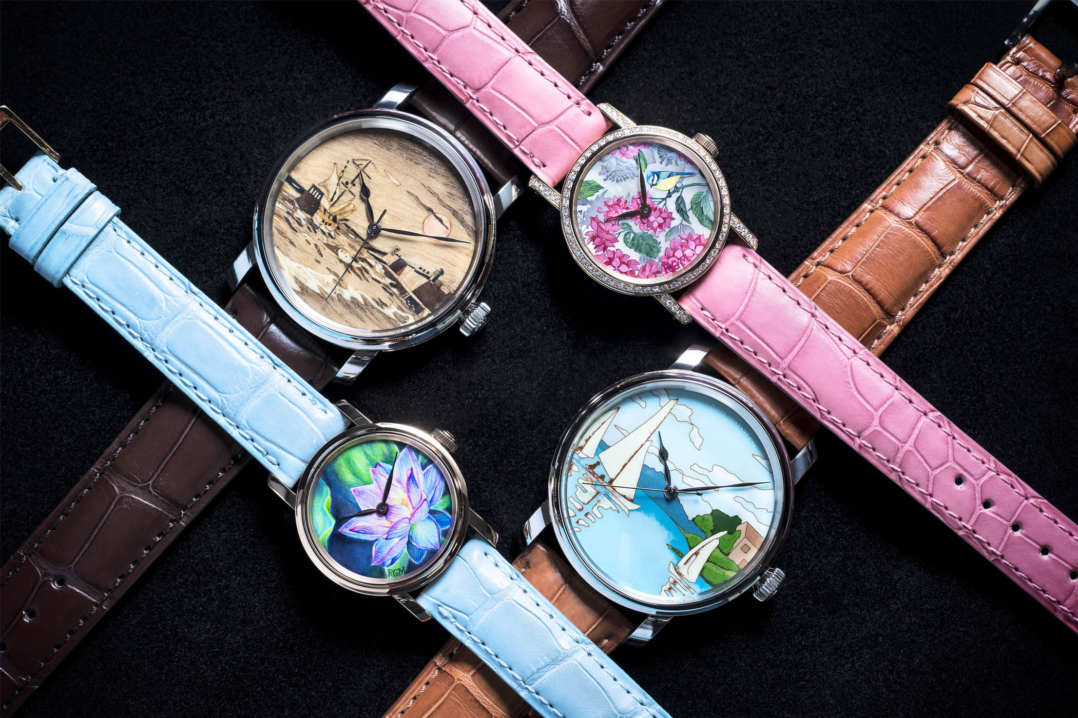 Because the petite 28mm watches are all about the old-world craft of hand painting, RGM did not produce a new movement for the series. Instead, for these women’s watches, he turns to a stellar calibre, the Swiss-made ETA-Peseux 70001 hand-wound movement with 17 jewels and 42 hours of power reserve. With precision ensured on the inside, RGM turned a host of artists from around the world to do the hand painting of the two versions.