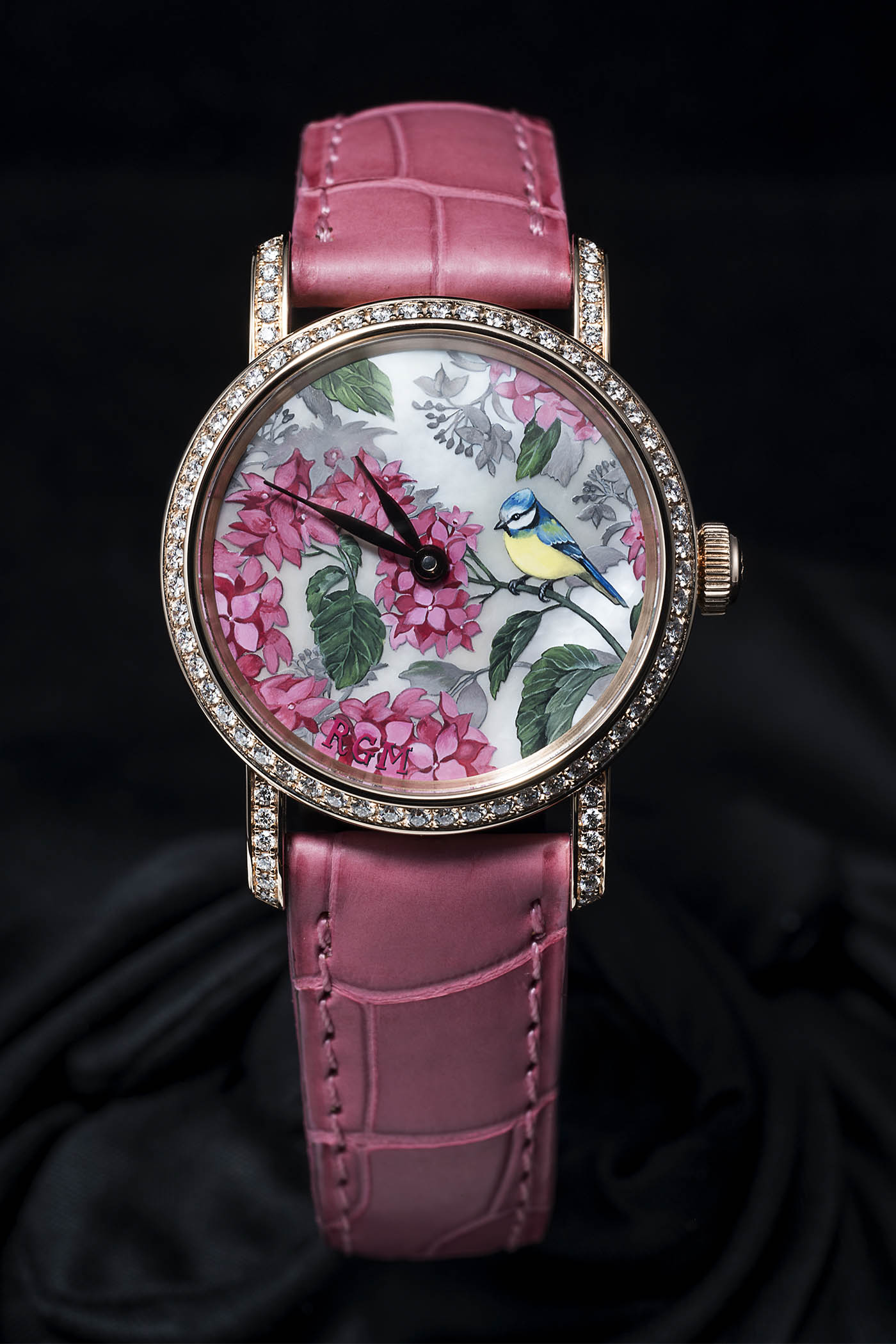 One Lady RGM watch features a miniature hand painting on a mother-of-pearl dial and depicts a beautiful blue titmouse bird with yellow breast perched on a flower branch. The flowers are depicted in pink and resemble cherry blossoms or hydrangeas. The shadows of certain blossoms fall behind them in shades of grey, and in a few places green leaves pop out, as well. The simple beauty and detailed painting of this dial is a study in art and elegance. This version is offered in stainless steel or in 18-karat rose gold with a diamond-set case and lugs. It is finished with a Keystone insignia alligator strap in a bright pink that matches the flowers.
