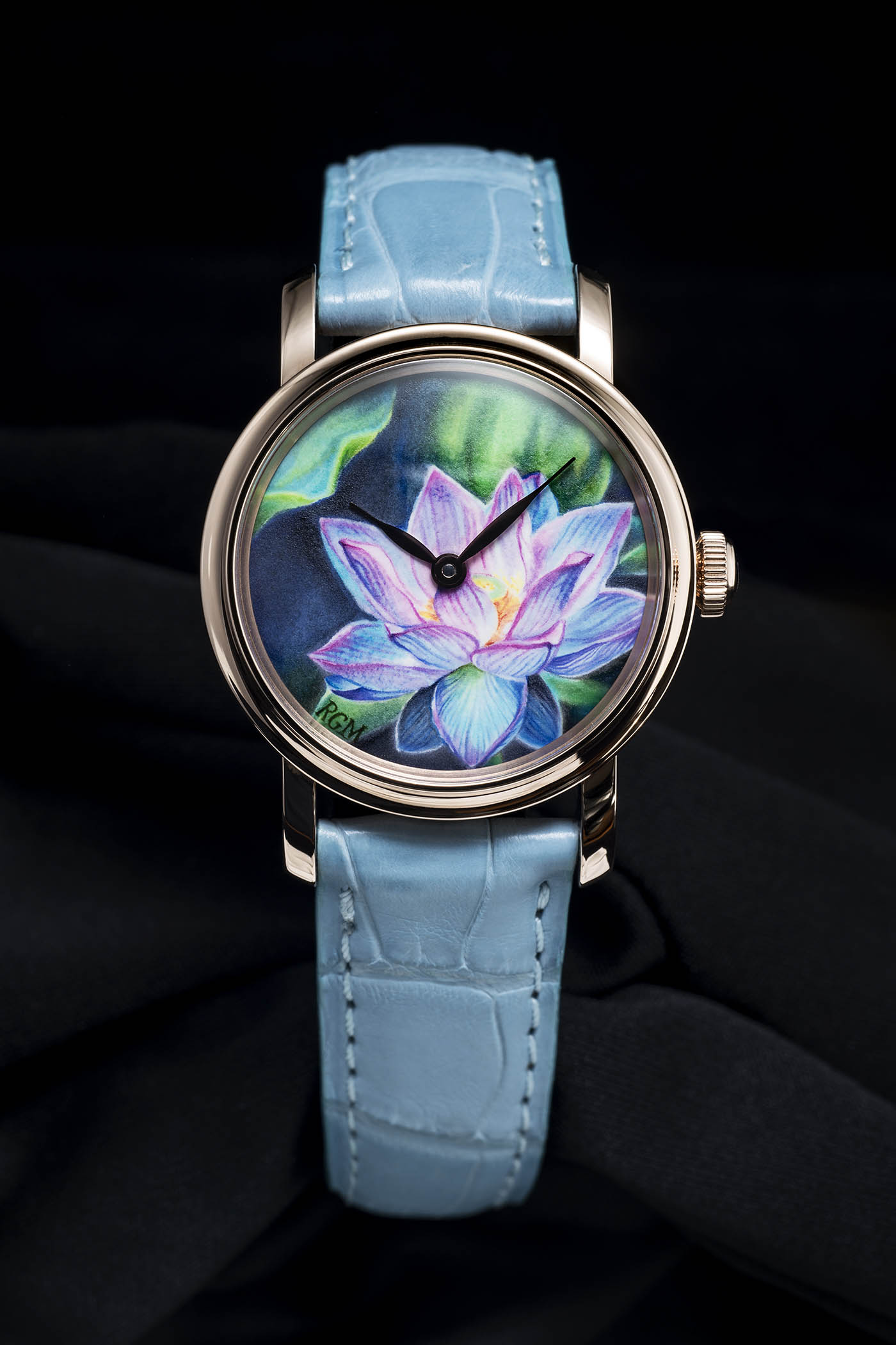 The second Lady RGM art watch being released showcases miniature hand painting but with luminous paint. The lotus flower is created in hues of pink, lavender, blue and purple with a centre showcasing some fire yellow and red. It seems to occupy three-quarters of the dial, which is midnight blue behind the lotus with wisps of fluorescent green floating on the edges looking almost like the Northern lights. Thanks to multiple layers and levels of luminous paint, the dial has a depth and glow to it that offers it a unique character. This watch is finished with a pale blue alligator strap that matches the blue in the petals. Crafted in 18-karat rose gold, it is also available in a 28mm case made of American stainless steel.