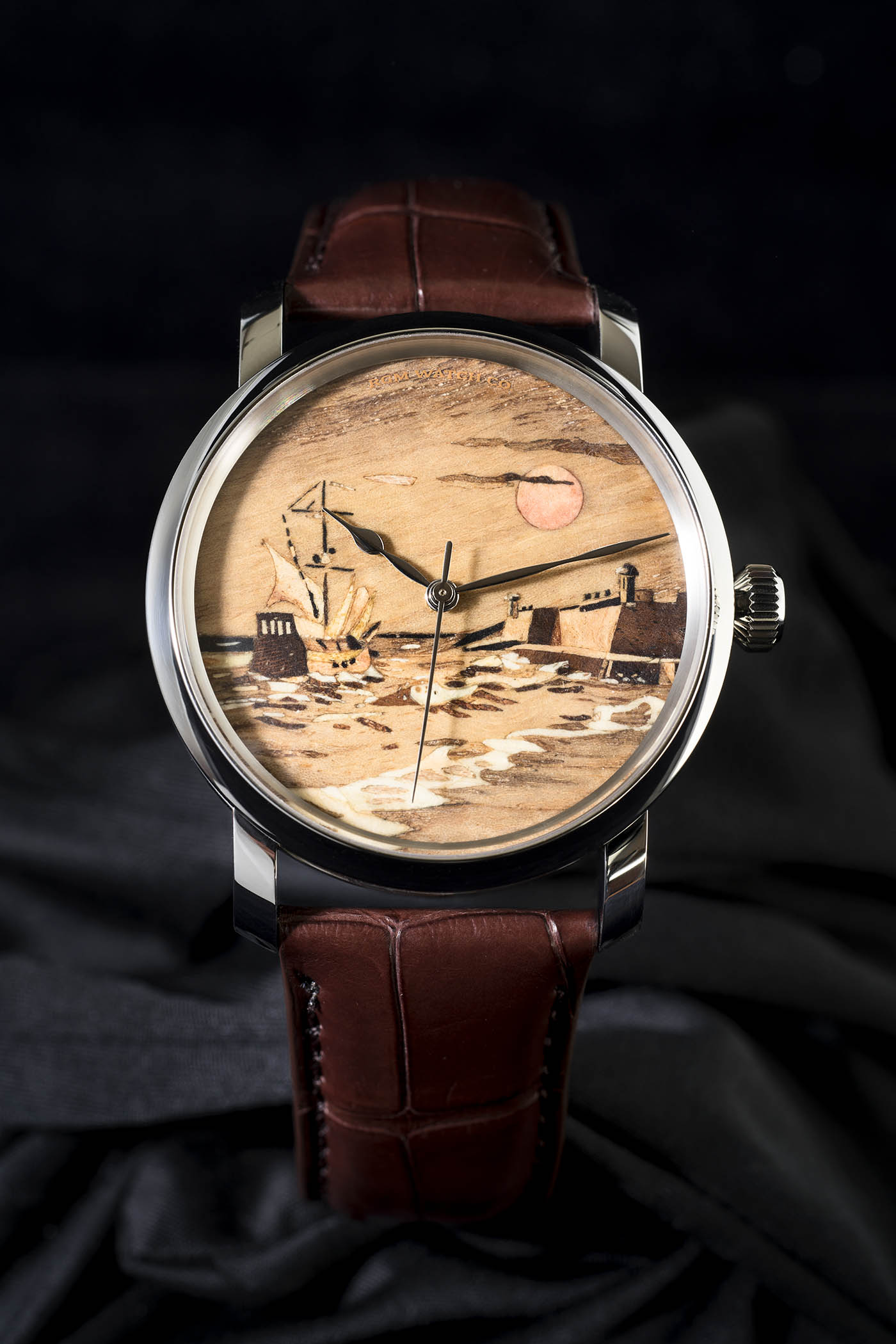 The two 40mm men’s Art watches are inspired by the sea. One features a cloisonné enamel dial that recalls Monet’s Regatta at Argenteuil with vivid hues of blue with white sailboats and a touch of verdant green in the background. The wood marquetry dial watch is inspired by Castillo de San Marcos fort in St. Augustine, Florida. The stainless steel case is made in America, and these watches are fitted with Swiss automatic movements that house a solid gold RGM perlage-finished rotor. The watches offer 42 hours of power reserve and feature a sapphire caseback for viewing the movement. Interestingly, both of these models retail for USD 13,900.