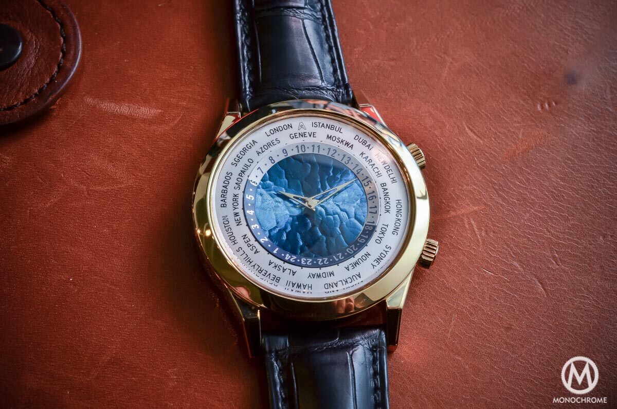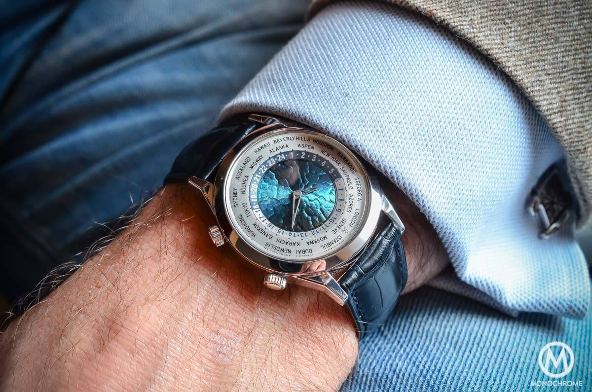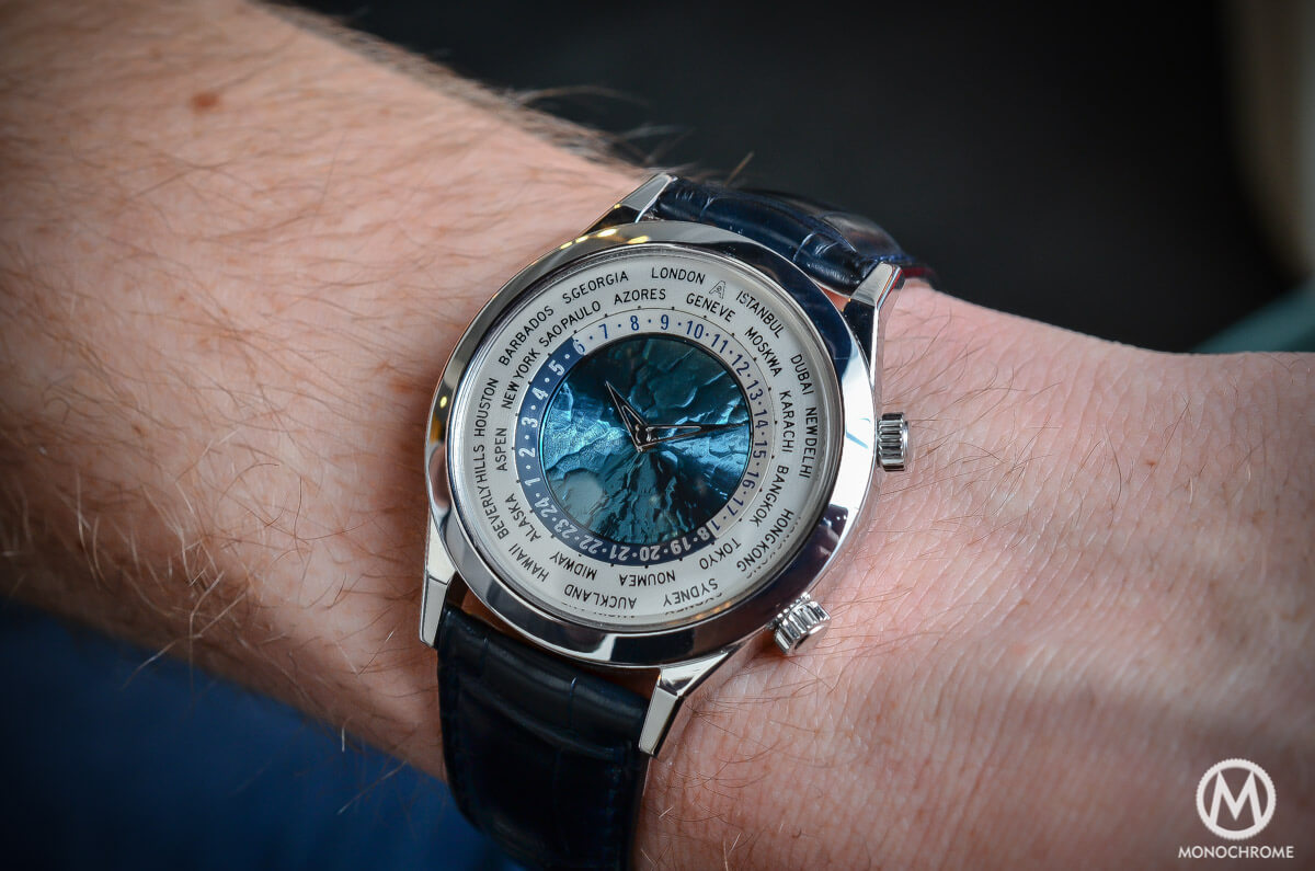 Back in the late 1930s, Louis Cottier, a famous watchmaker, developed an unseen complication able to display the exact time of the main cities all around the world in a single dial: the world timer. It was first seen in 1937 on a (possibly) unique piece by Patek Philippe, the ref. 515, a rectangular watch (photo here). Back then, this watch and the very few editions that follow were fitted with only one crown, that both adjust the local time (in the center part of the dial) and the 24-hour ring. The common point of these early world timer watches are the cities printed on a fixed ring or directly engraved on a large bezel, outside the dial – the ring featuring the different time zones cannot be repositioned by the wearer.