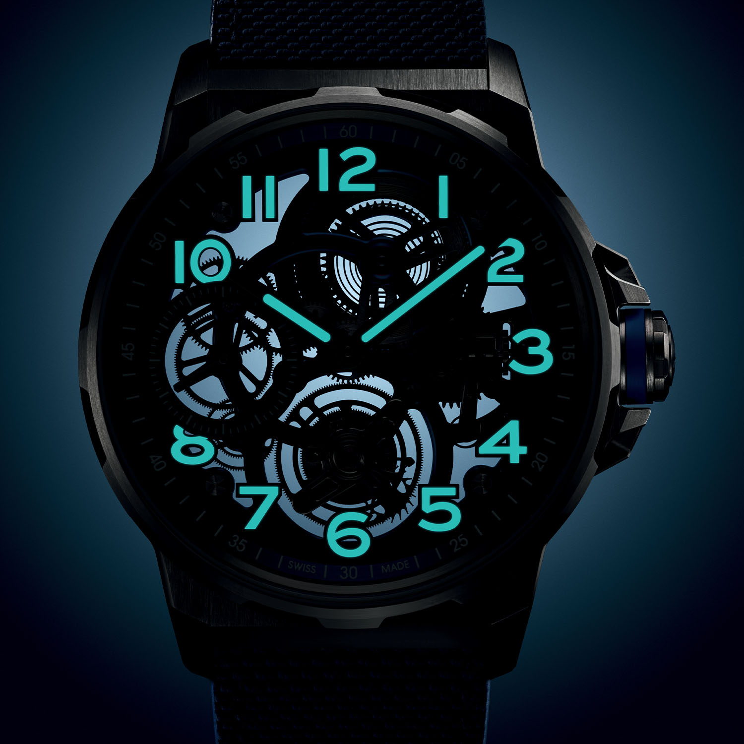 The dial – or the absence of a dial, to be precise – reveals equally dynamic lines through the sapphire crystal. An inner flange partially holds in place applied Arabic numerals, which feel suspended over the movement. The entire front is playing on blue hues obtained by PVD treatment – the flange, bridges and small seconds at 9 o’clock – with contrasting hands and markers all filled with SLN.